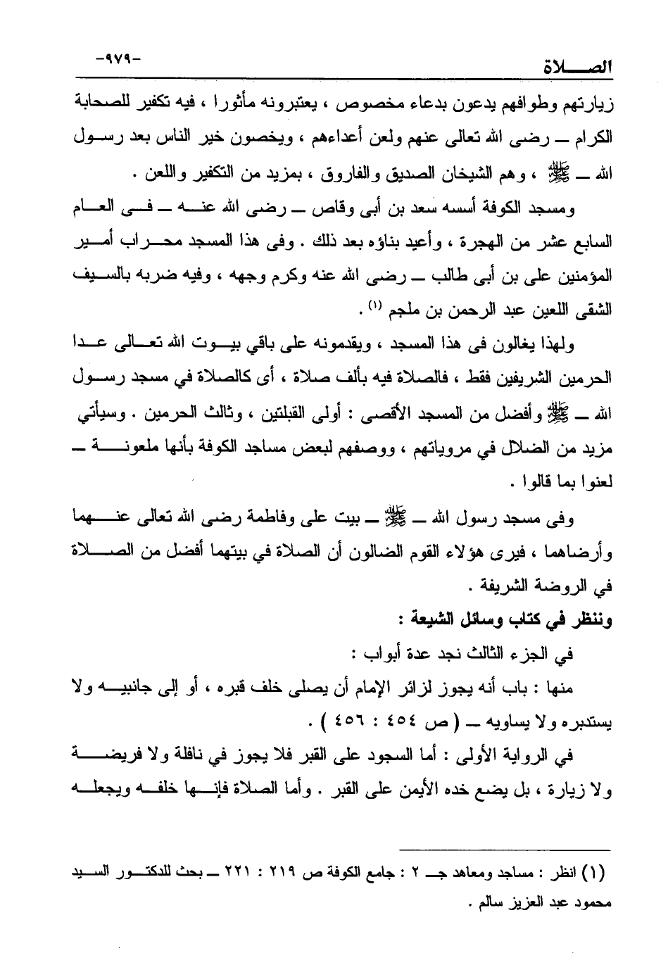 ولهذا يغالون فى هذا المسجد، ويقدمونه على باقي بيوت الله تعالى عدا الحرمين الشريفين فقط، فالصلاة فيه بألف صلاة، أي كالصلاة في مسجد رسول الله ـ - صَلَّى اللهُ عَلَيْهِ وَسَلَّمَ - وأفضل من المسجد الأقصى: أولى القبلتين، وثالث الحرمين. وسيأتي مزيد من الضلال في مروياتهم، ووصفهم لبعض مساجد الكوفة بأنها ملعونة ـ لعنوا بما قالوا.