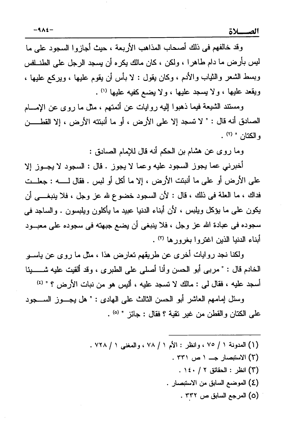 ومستند الشيعة فيما ذهبوا إليه روايات عن أئمتهم، مثل ما روى عن الإمام الصادق أنه قال: " لا تسجد إلا على الأرض، أو ما أنبتته الأرض، إلا القطن والكتان " (¬2) .