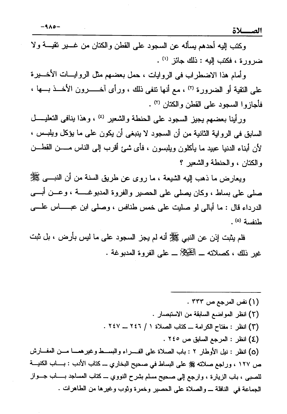 ويعارض ما ذهب إليه الشيعة، ما روى عن طريق السنة من أن النبى - صَلَّى اللهُ عَلَيْهِ وَسَلَّمَ - صلى على بساط، وكان يصلى على الحصير والفروة المدبوغة، وعن أبى الدرداء قال: ما أبالى لو صليت على خمس طنافس، وصلى ابن عباس على طنفسة (¬5) .