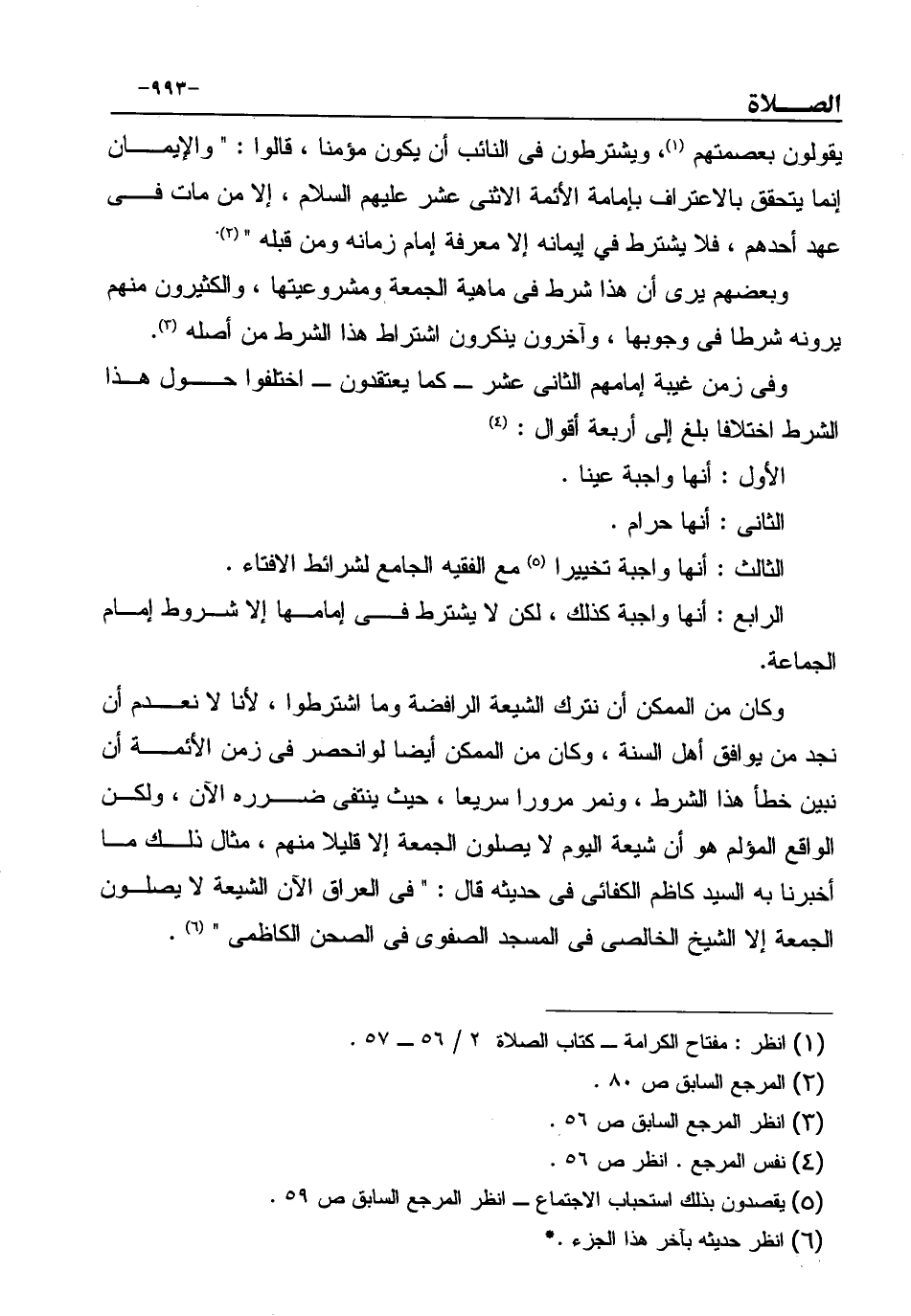 وكان من الممكن أن نترك الشيعة الرافضة وما اشترطوا، لأنا لا نعدم أن نجد من يوافق أهل السنة، وكان من الممكن أيضاً لوانحصر فى زمن الأئمة أن نبين خطأ هذا الشرط، ونمر مرورا سريعاً، حيث ينتفى ضرره الآن، ولكن الواقع المؤلم هو أن شيعة اليوم لا يصلون الجمعة إلا قليلا منهم، مثال ذلك ما أخبرنا به السيد كاظم الكفائى فى حديثه قال: " فى العراق الآن الشيعة لا يصلون الجمعة إلا الشيخ الخالصى فى المسجد الصفوى فى الصحن الكاظمى " (¬6) .