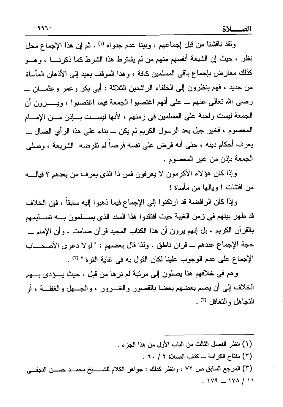 ولقد ناقشنا من قبل إجماعهم، وبينا عدم جدواه (¬1) . ثم إن هذا الإجماع محل نظر، حيث إن الشيعة أنفسهم منهم من لم يشترط هذا الشرط كما ذكرنا، وهو كذلك معارض بإجماع باقى المسلمين كافة، وهذا الموقف يعيد إلى الأذهان المأساة من جديد، فهم ينظرون إلى الخلفاء الراشدين الثلاثة: أبى بكر وعمر وعثمان ـ رضي الله تعالى عنهم ـ على أنهم اغتصبوا الجمعة فيما اغتصبوا، ويرون أن الجمعة ليست واجبة على المسلمين فى زمنهم، لأنها ليست بإذن من الإمام المعصوم، فخير جيل بعد الرسول الكريم لم يكن ـ بناء على هذا الرأي الضال ـ يعرف أحكام دينه، حتى أنه فرض على نفسه فرضاً لم تفرضه الشريعة، وصلى الجمعة بإذن من غير المعصوم.
