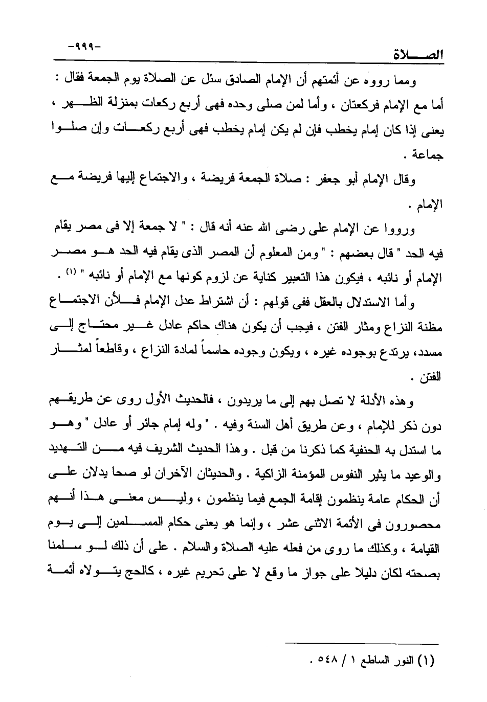 وهذه الأدلة لا تصل بهم إلى ما يريدون، فالحديث الأول روى عن طريقهم دون ذكر للإمام، وعن طريق أهل السنة وفيه. " وله إمام جائر أو عادل " وهو ما استدل به الحنفية كما ذكرنا من قبل. وهذا الحديث الشريف فيه من التهديد والوعيد ما يثير النفوس المؤمنة الزاكية. والحديثان الآخران لو صحا يدلان على أن الحكام عامة ينظمون إقامة الجمع فيما ينظمون، وليس معنى هذا أنهم محصورون فى الأئمة الاثنى عشر، وإنما هو يعنى حكام المسلمين إلى يوم القيامة، وكذلك ما روى من فعله عليه الصلاة والسلام. على أن ذلك لو سلمنا بصحته لكان دليلا على جواز ما وقع لا على تحريم غيره، كالحج يتولاه أئمة