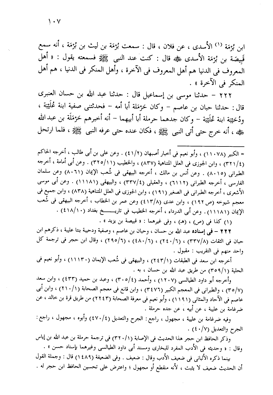 222- حَدثنا مُوسَى بْنُ إِسْمَاعِيلَ، قَالَ: حَدثنا عَبْدُ اللهِ بْنُ حَسَّانَ الْعَنْبَرِيُّ، قَالَ: حَدثنا حِبَّانُ بْنُ عَاصِمٍ، وَكَانَ حَرْمَلَةُ أَبَا أُمِّهِ، فَحَدَّثَتْنِي صَفِيَّةُ ابْنَةُ عُلَيْبَةَ، وَدُحَيْبَةُ ابْنَةُ عُلَيْبَةَ، وَكَانَ جَدَّهُمَا حَرْمَلَةُ أَبَا أَبِيهِمَا، أَنَّهُ أَخْبَرَهُمْ، عَنْ حَرْمَلَةَ بْنِ عَبْدِ اللهِ، أَنَّهُ خَرَجَ حَتَّى أَتَى النَّبِيَّ صَلى الله عَلَيهِ وسَلم، فَكَانَ عِنْدَهُ حَتَّى عَرَفَهُ النَّبِيُّ صَلى الله عَلَيهِ وسَلم، فَلَمَّا ارْتَحَلَ قُلْتُ فِي نَفْسِي: وَاللَّهِ لَآتِيَنَّ النَّبِيَّ صَلى الله عَلَيهِ وسَلم حَتَّى أَزْدَادَ مِنَ الْعِلْمِ، فَجِئْتُ أَمْشِي حَتَّى قُمْتُ بَيْنَ يَدَيْهِ فَقُلْتُ مَا تَأْمُرُنِي أَعْمَلُ؟ قَالَ: يَا حَرْمَلَةُ، ائْتِ الْمَعْرُوفَ، وَاجْتَنَبِ الْمُنْكَرَ، ثُمَّ رَجَعْتُ، حَتَّى جِئْتُ الرَّاحِلَةَ، ثُمَّ أَقْبَلْتُ حَتَّى قُمْتُ مَقَامِي قَرِيبًا مِنْهُ، فَقُلْتُ: يَا رَسُولَ اللهِ، مَا تَأْمُرُنِي أَعْمَلُ؟ قَالَ: يَا حَرْمَلَةُ، ائْتِ الْمَعْرُوفَ، وَاجْتَنَبِ الْمُنْكَرَ، وَانْظُرْ مَا يُعْجِبُ أُذُنَكَ أَنْ يَقُولَ لَكَ الْقَوْمُ إِذَا قُمْتَ مِنْ عِنْدِهِمْ فَأْتِهِ، وَانْظُرِ الَّذِي تَكْرَهُ أَنْ يَقُولَ لَكَ الْقَوْمُ إِذَا قُمْتَ مِنْ عِنْدِهِمْ فَاجْتَنِبْهُ، فَلَمَّا رَجَعْتُ تَفَكَّرْتُ، فَإِذَا هُمَا لَمْ يَدَعَا شَيْئًا.