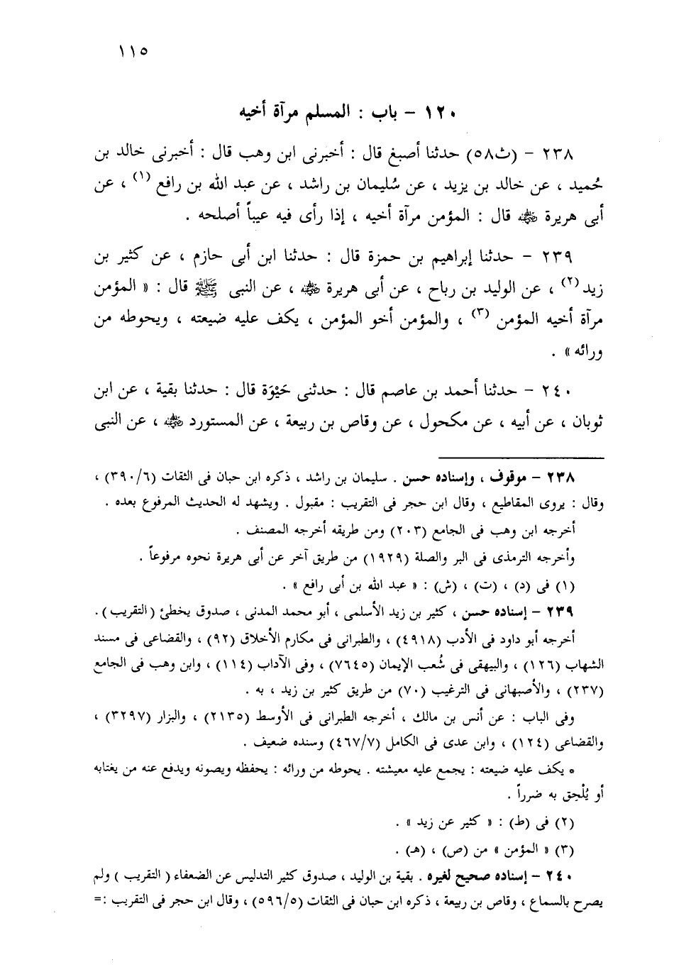 239- حَدثنا إِبْرَاهِيمُ بْنُ حَمْزَةَ، قَالَ: حَدثنا ابْنُ أَبِي حَازِمٍ، عَنْ كَثِيرِ بْنِ زَيْدٍ، عَنِ الْوَلِيدِ بْنِ رَبَاحٍ، عَنْ أَبِي هُرَيْرَةَ، عَنِ النَّبِيِّ صَلى الله عَلَيهِ وسَلم قَالَ: الْمُؤْمِنُ مَرْآةُ أَخِيهِ، وَالْمُؤْمِنُ أَخُو الْمُؤْمِنِ، يَكُفُّ عَلَيْهِ ضَيْعَتَهُ، وَيَحُوطُهُ مِنْ وَرَائِهِ.