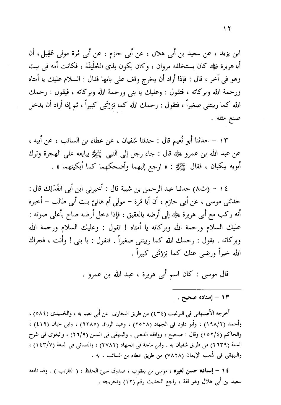 14- حَدثنا عَبْدُ الرَّحْمَنِ بْنُ شَيْبَةَ قَالَ: أَخْبَرَنِي ابْنُ أَبِي الْفُدَيْكِ قَالَ: حَدَّثَنِي مُوسَى، عَنْ أَبِي حَازِمٍ، أَنَّ أَبَا مُرَّةَ، مَوْلَى أُمِّ هَانِئِ بِنْت أَبِي طَالِبٍ أَخْبَرَهُ، أَنَّهُ رَكِبَ مَعَ أَبِي هُرَيْرَةَ إِلَى أَرْضِهِ بِالْعَقِيقِ فَإِذَا دَخَلَ أَرْضَهُ صَاحَ بِأَعْلَى صَوْتِهِ: عَلَيْكِ السَّلاَمُ وَرَحْمَةُ اللهِ وَبَرَكَاتُهُ يَا أُمَّتَاهُ، تَقُولُ: وَعَلَيْكَ السَّلاَمُ وَرَحْمَةُ اللهِ وَبَرَكَاتُهُ، يَقُولُ: رَحِمَكِ اللهُ رَبَّيْتِنِي صَغِيرًا، فَتَقُولُ: يَا بُنَيَّ، وَأَنْتَ فَجَزَاكَ اللهُ خَيْرًا وَرَضِيَ عَنْكَ كَمَا بَرَرْتَنِي كَبِيرًا.