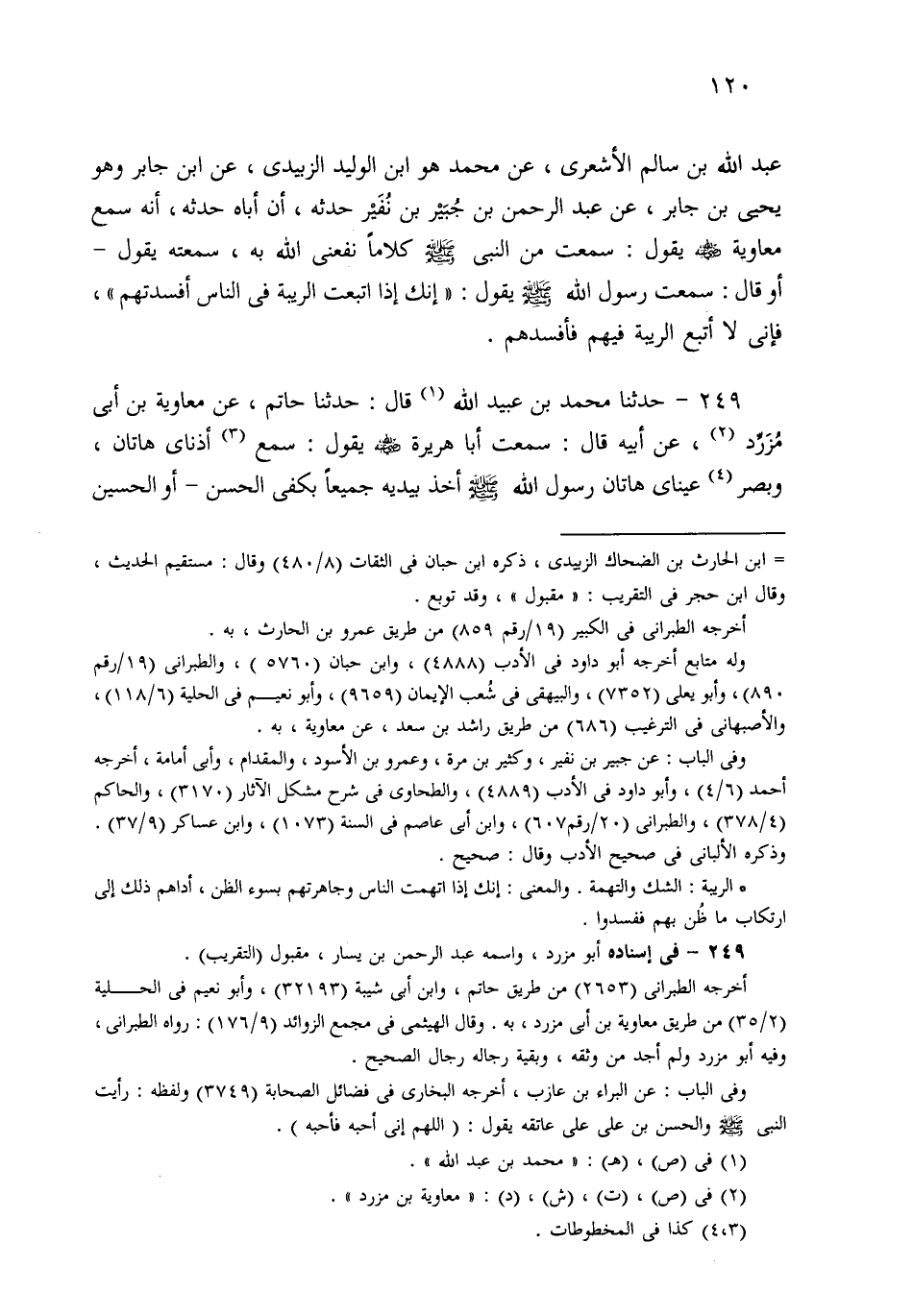 249- حَدثنا مُحَمَّدُ بْنُ عُبَيْدِ اللهِ، قَالَ: حَدثنا حَاتِمٌ، عَنْ مُعَاوِيَةَ بْنِ أَبِي مُزَرِّدٍ، عَنْ أَبِيهِ قَالَ: سَمِعْتُ أَبَا هُرَيْرَةَ يَقُولُ: سَمِعَ أُذُنَايَ هَاتَانِ، وَبَصُرَ عَيْنَايَ هَاتَانِ رَسُولَ اللهِ صَلى الله عَلَيهِ وسَلم أَخَذَ بِيَدَيْهِ جَمِيعًا بِكَفَّيِّ الْحَسَنِ، أَوِ الْحُسَيْنِ صَلَوَاتُ اللهِ عَلَيْهِمَا وَقَدَمَيهِ عَلَى قَدَمِ رَسُولِ اللهِ صَلى الله عَلَيهِ وسَلم، وَرَسُولُ اللهِ صَلى الله عَلَيهِ وسَلم يَقُولُ: ارْقَهْ، قَالَ: فَرَقِيَ الْغُلاَمُ حَتَّى وَضَعَ قَدَمَيْهِ عَلَى صَدْرِ رَسُولِ اللهِ صَلى الله عَلَيهِ وسَلم، ثُمَّ قَالَ رَسُولُ اللهِ صَلى الله عَلَيهِ وسَلم: افْتَحْ فَاكَ، ثُمَّ قَبَّلَهُ، ثُمَّ قَالَ: اللَّهُمَّ أَحِبَّهُ، فَإِنِّي أُحِبُّهُ.