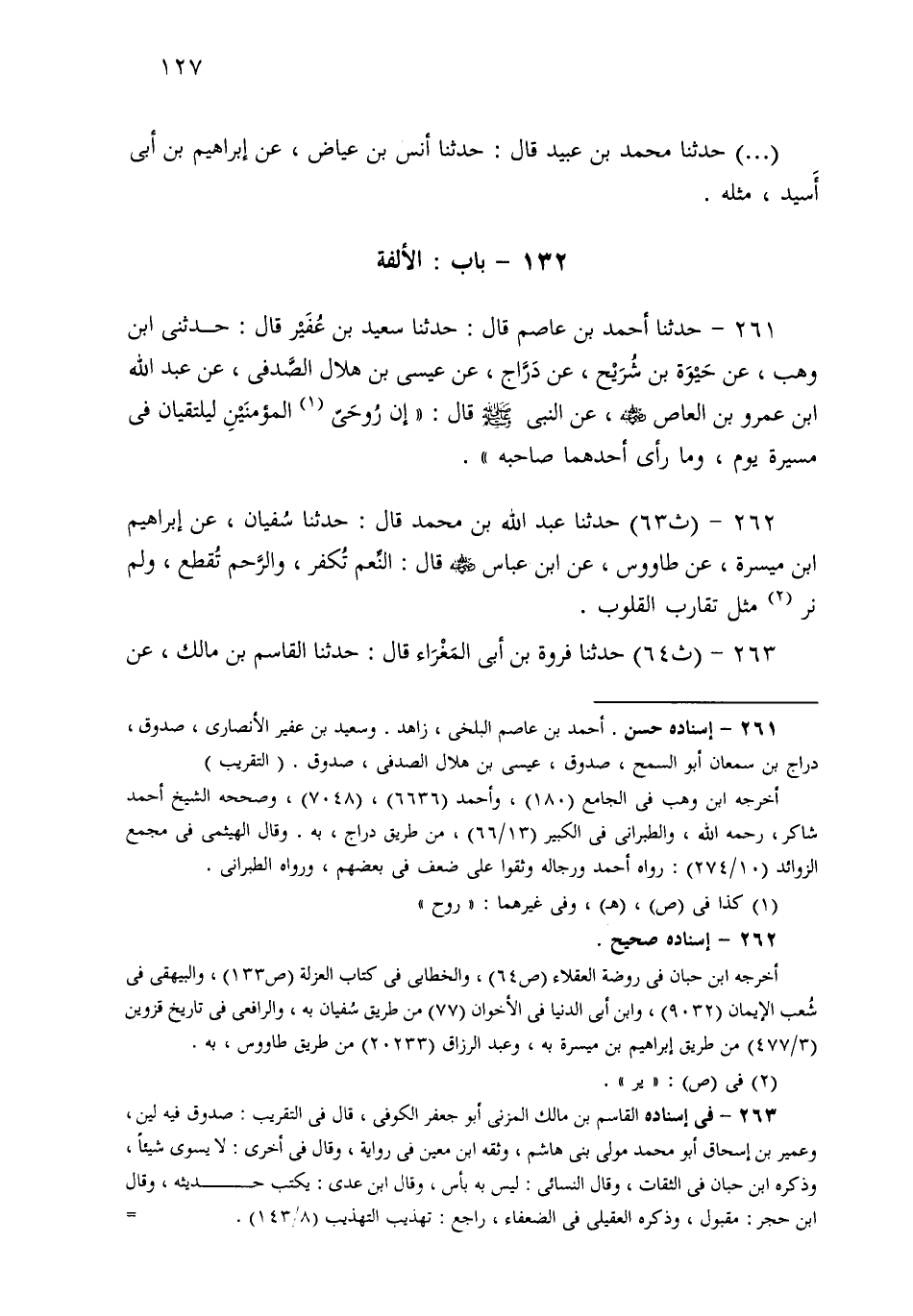 261- حَدثنا أَحْمَدُ بْنُ عَاصِمٍ، قَالَ: حَدثنا سَعِيدُ بْنُ عُفَيْرٍ قَالَ: حَدَّثَنِي ابْنُ وَهْبٍ، عَنْ حَيْوَةَ بْنِ شُرَيْحٍ، عَنْ دَرَّاجٍ، عَنْ عِيسَى بْنِ هِلاَلٍ الصَّدَفِيِّ، عَنْ عَبْدِ اللهِ بْنِ عَمْرِو بْنِ الْعَاصِ، عَنِ النَّبِيِّ صَلى الله عَلَيهِ وسَلم قَالَ: إِنَّ رُوحَ الْمُؤْمِنَيْنِ لَيَلْتَقِيَانِ فِي مَسِيرَةِ يَوْمٍ، وَمَا رَأَى أَحَدُهُمَا صَاحِبَهُ.