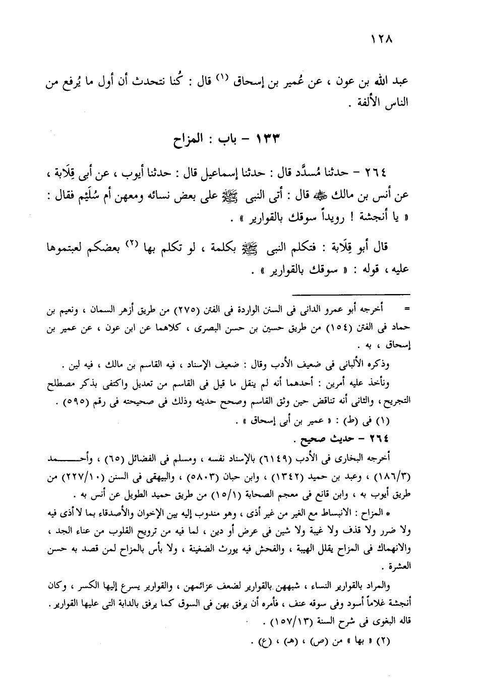 264- حَدثنا مُسَدَّدٌ، قَالَ: حَدثنا إِسْمَاعِيلُ، قَالَ: حَدثنا أَيُّوبُ، عَنْ أَبِي قِلاَبَةَ، عَنْ أَنَسِ بْنِ مَالِكٍ قَالَ: أَتَى النَّبِيُّ صَلى الله عَلَيهِ وسَلم عَلَى بَعْضِ نِسَائِهِ وَمَعَهُنَّ أُمُّ سُلَيْمٍ، فَقَالَ: يَا أَنْجَشَةُ، رُوَيْدًا سَوْقَكَ بِالْقَوَارِيرِ.