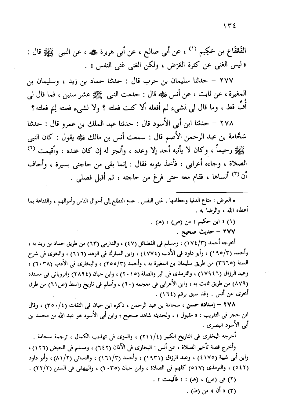 277- حَدثنا سُلَيْمَانُ بْنُ حَرْبٍ، قَالَ: حَدثنا حَمَّادُ بْنُ زَيْدٍ، وَسُلَيْمَانُ بْنُ الْمُغِيرَةِ، عَنْ ثَابِتٍ، عَنْ أَنَسٍ قَالَ: خَدَمْتُ النَّبِيَّ صَلى الله عَلَيهِ وسَلم عَشْرَ سِنِينَ، فَمَا قَالَ لِي: أُفٍّ، قَطُّ، وَمَا قَالَ لِي لِشَيْءٍ لَمْ أَفْعَلْهُ: أَلاَ كُنْتَ فَعَلْتَهُ؟ وَلاَ لِشَيْءٍ فَعَلْتُهُ: لِمَ فَعَلْتَهُ؟.