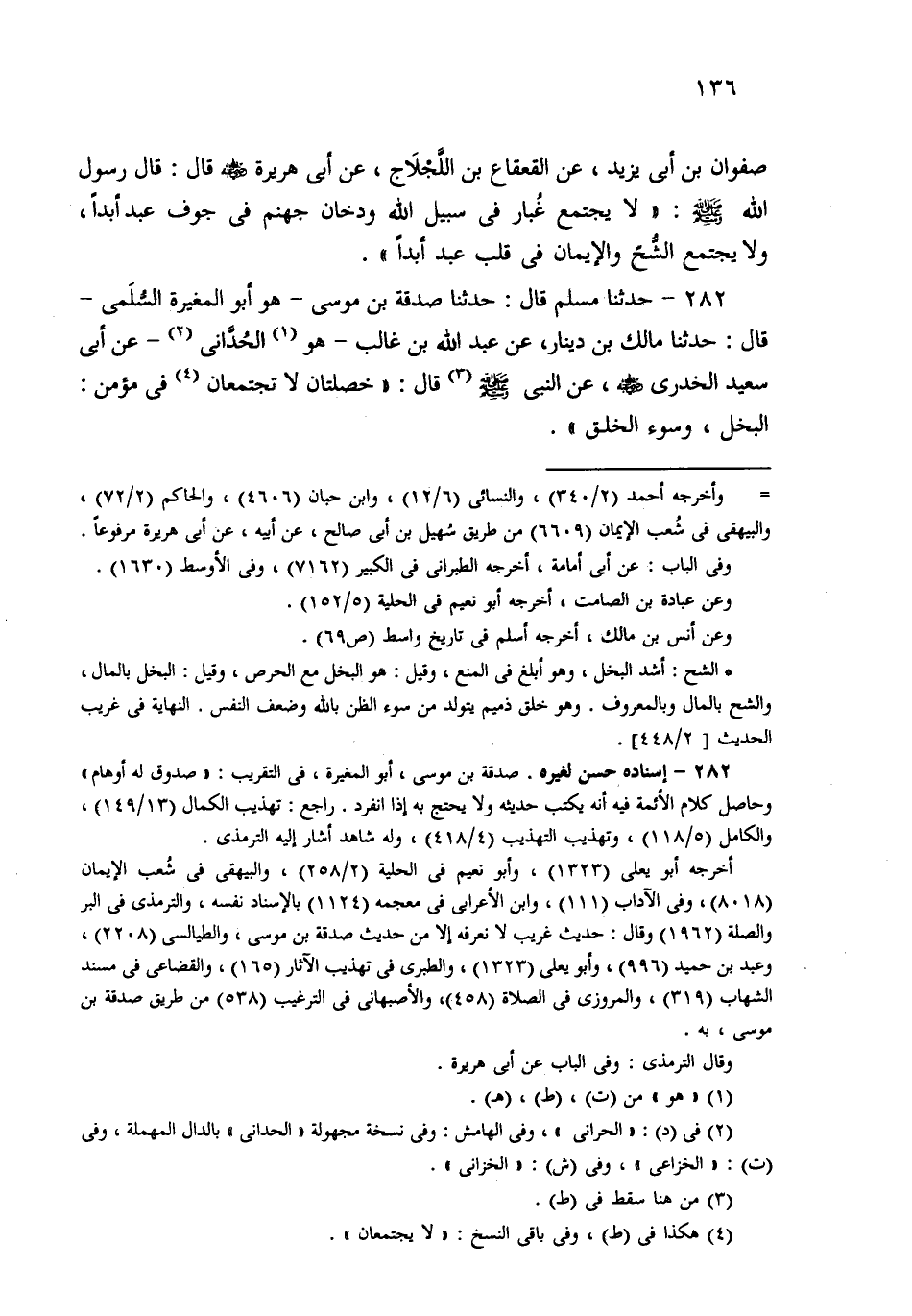 282- حَدثنا مُسْلِمٌ، قَالَ: حَدثنا صَدَقَةُ بْنُ مُوسَى هُوَ أَبُو الْمُغِيرَةِ السُّلَمِيُّ، قَالَ: حَدثنا مَالِكُ بْنُ دِينَارٍ، عَنْ عَبْدِ اللهِ بْنِ غَالِبٍ هُوَ الْحُدَّانِيُّ، عَنْ أَبِي سَعِيدٍ الْخُدْرِيِّ، عَنِ النَّبِيِّ صَلى الله عَلَيهِ وسَلم قَالَ: خَصْلَتَانِ لاَ يَجْتَمِعَانِ فِي مُؤْمِنٍ: الْبُخْلُ وَسُوءُ الْخُلُقِ.