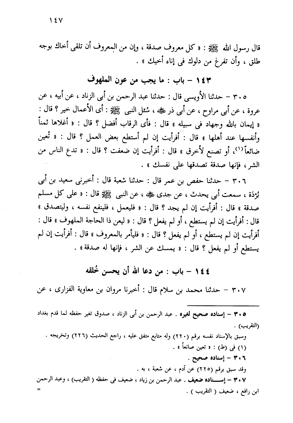 305- حَدثنا الأُوَيْسِيُّ، قَالَ: حَدثنا عَبْدُ الرَّحْمَنِ بْنُ أَبِي الزِّنَادِ، عَنْ أَبِيهِ، عَنْ عُرْوَةَ، عَنْ أَبِي مُرَاوِحٍ، عَنْ أَبِي ذَرٍّ: سُئِلَ النَّبِيُّ صَلى الله عَلَيهِ وسَلم: أَيُّ الأَعْمَالِ خَيْرٌ؟ قَالَ: إِيمَانٌ بِاللهِ، وَجِهَادٌ فِي سَبِيلِهِ، قَالَ: فَأَيُّ الرِّقَابِ أَفْضَلُ؟ قَالَ: أَغْلاَهَا ثَمَنًا، وَأَنْفَسُهَا عِنْدَ أَهْلِهَا، قَالَ: أَفَرَأَيْتَ إِنْ لَمْ أَسْتَطِعْ بَعْضَ الْعَمَلِ؟ قَالَ: تُعِينُ ضَائِعًا، أَوْ تَصْنَعُ لأَخْرَقَ، قَالَ: أَفَرَأَيْتَ إِنْ ضَعُفْتُ؟ قَالَ: تَدَعُ النَّاسَ مِنَ الشَّرِّ، فَإِنَّهَا صَدَقَةٌ تَصَدَّقَهَا عَلَى نَفْسِكَ.
