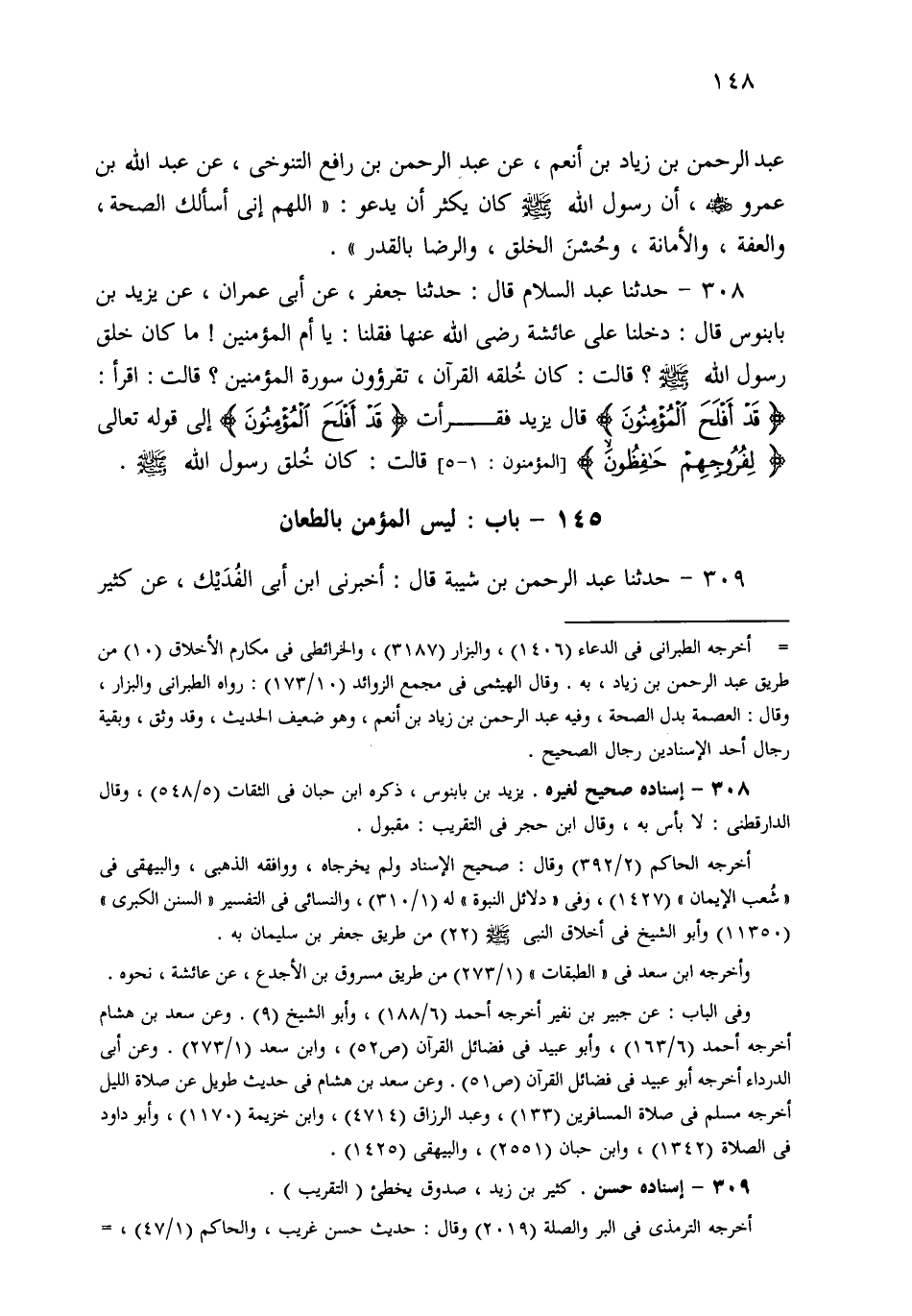 308- حَدثنا عَبْدُ السَّلامِ، قَالَ: حَدثنا جَعْفَرٌ، عَنْ أَبِي عِمْرَانَ، عَنْ يَزِيدَ بْنِ بَابَنُوسَ قَالَ: دَخَلْنَا عَلَى عَائِشَةَ فَقُلْنَا: يَا أُمَّ الْمُؤْمِنِينَ، مَا كَانَ خُلُقُ رَسُولِ اللهِ صَلى الله عَلَيهِ وسَلم؟ قَالَتْ: كَانَ خُلُقُهُ الْقُرْآنَ، تَقْرَؤُونَ سُورَةَ الْمُؤْمِنِينَ؟ قَالَتِ: اقْرَأْ: {قَدْ أَفْلَحَ الْمُؤْمِنُونَ}، قَالَ يَزِيدُ: فَقَرَأْتُ: {قَدْ أَفْلَحَ الْمُؤْمِنُونَ} إِلَى {لِفُرُوجِهِمْ حَافِظُونَ}، قَالَتْ: هَكَذَا كَانَ خُلُقُ رَسُولِ اللهِ صَلى الله عَلَيهِ وسَلم.