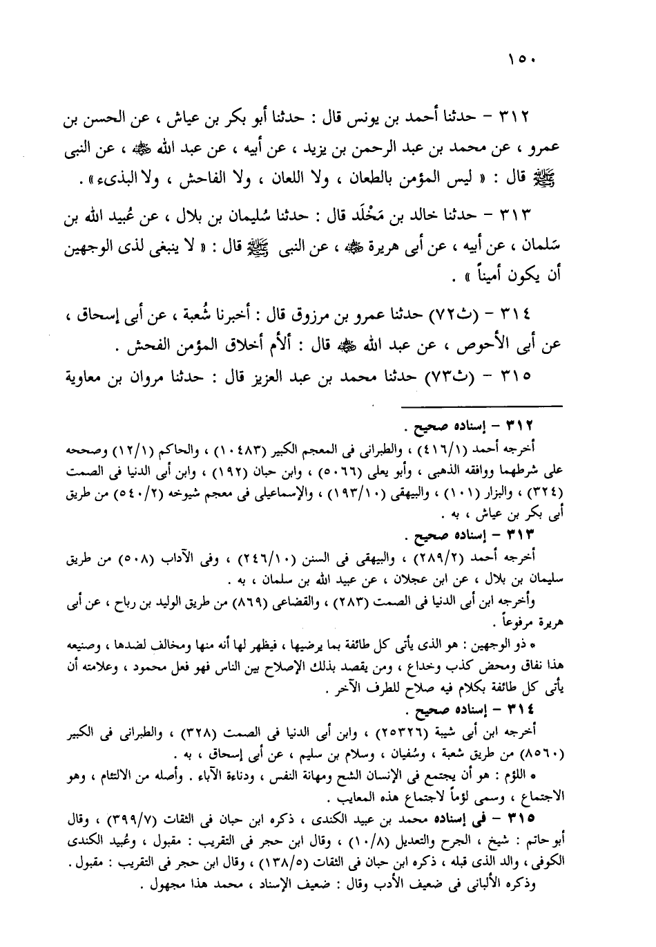 312- حَدثنا أَحْمَدُ بْنُ يُونُسَ، قَالَ: حَدثنا أَبُو بَكْرِ بْنُ عَيَّاشٍ، عَنِ الْحَسَنِ بْنِ عَمْرٍو، عَنْ مُحَمَّدِ بْنِ عَبْدِ الرَّحْمَنِ بْنِ يَزِيدَ، عَنْ أَبِيهِ، عَنْ عَبْدِ اللهِ، عَنِ النَّبِيِّ صَلى الله عَلَيهِ وسَلم قَالَ: لَيْسَ الْمُؤْمِنُ بِالطَّعَّانِ، وَلاَ اللِّعَانِ، وَلاَ الْفَاحِشِ وَلاَ الْبَذِي.