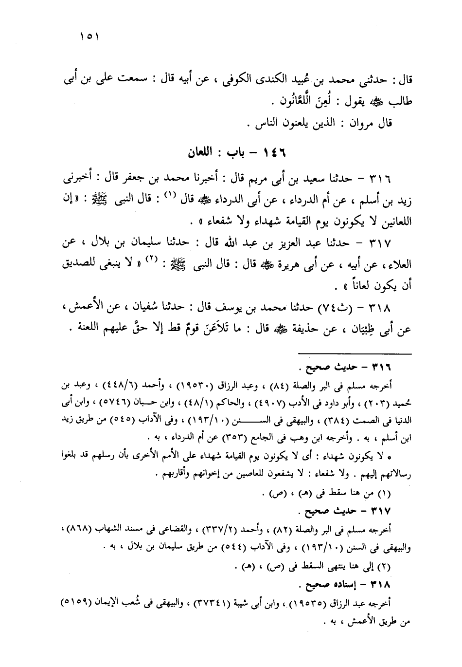 316- حَدثنا سَعِيدُ بْنُ أَبِي مَرْيَمَ، قَالَ: أَخْبَرَنَا مُحَمَّدُ بْنُ جَعْفَرٍ قَالَ: أَخْبَرَنِي زَيْدُ بْنُ أَسْلَمَ، عَنْ أُمِّ الدَّرْدَاءِ، عَنْ أَبِي الدَّرْدَاءِ قَالَ: قَالَ النَّبِيُّ صَلى الله عَلَيهِ وسَلم: إِنَّ اللَّعَّانِينَ لاَ يَكُونُونَ يَوْمَ الْقِيَامَةِ شُهَدَاءَ، وَلا شُفَعَاءَ.