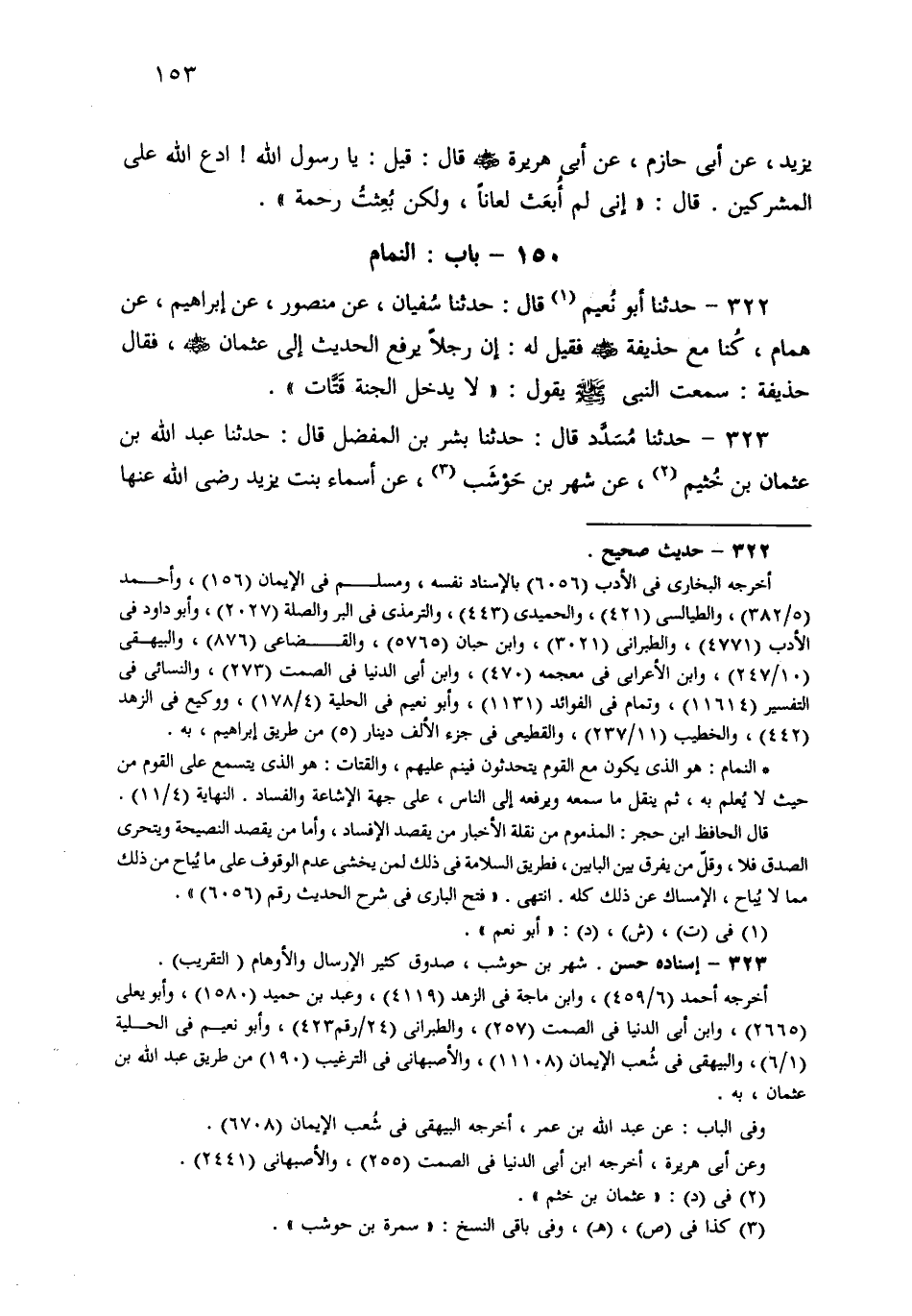 323- حَدثنا مُحَمَّدٍ، قَالَ: حَدثنا مُسَدَّدٌ، قَالَ: حَدثنا بِشْرُ بْنُ الْمُفَضَّلِ، قَالَ: حَدثنا عَبْدُ اللهِ بْنُ عُثْمَانَ بْنِ خُثَيْمٍ، عَنْ شَهْرِ بْنِ حَوْشَبٍ، عَنْ أَسْمَاءَ بِنْتِ يَزِيدَ قَالَتْ: قَالَ النَّبِيُّ صَلى الله عَلَيهِ وسَلم: أَلاَ أُخْبِرُكُمْ بِخِيَارِكُمْ؟ قَالُوا: بَلَى، قَالَ: الَّذِينَ إِذَا رُؤُوا ذُكِرَ اللَّهُ، أَفَلاَ أُخْبِرُكُمْ بِشِرَارِكُمْ؟ قَالُوا: بَلَى، قَالَ: الْمَشَّاؤُونَ بِالنَّمِيمَةِ، الْمُفْسِدُونَ بَيْنَ الأَحِبَّةِ، الْبَاغُونَ الْبُرَآءَ الْعَنَتَ.