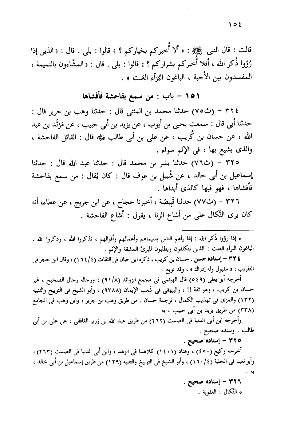 324- حَدثنا مُحَمَّدٍ، قَالَ: حَدثنا مُحَمَّدُ بْنُ الْمُثَنَّى، قَالَ: حَدثنا وَهْبُ بْنُ جَرِيرٍ، قَالَ: حَدثنا أَبِي قَالَ: سَمِعْتُ يَحْيَى بْنَ أَيُّوبَ، عَنْ يَزِيدَ بْنِ أَبِي حَبِيبٍ، عَنْ مَرْثَدِ بْنِ عَبْدِ اللهِ، عَنْ حَسَّانَ بْنِ كُرَيْبٍ، عَنْ عَلِيِّ بْنِ أَبِي طَالِبٍ رَضِيَ اللهُ عَنْهُ قَالَ: الْقَائِلُ الْفَاحِشَةَ، وَالَّذِي يُشِيعُ بِهَا، فِي الإِثْمِ سَوَاءٌ.