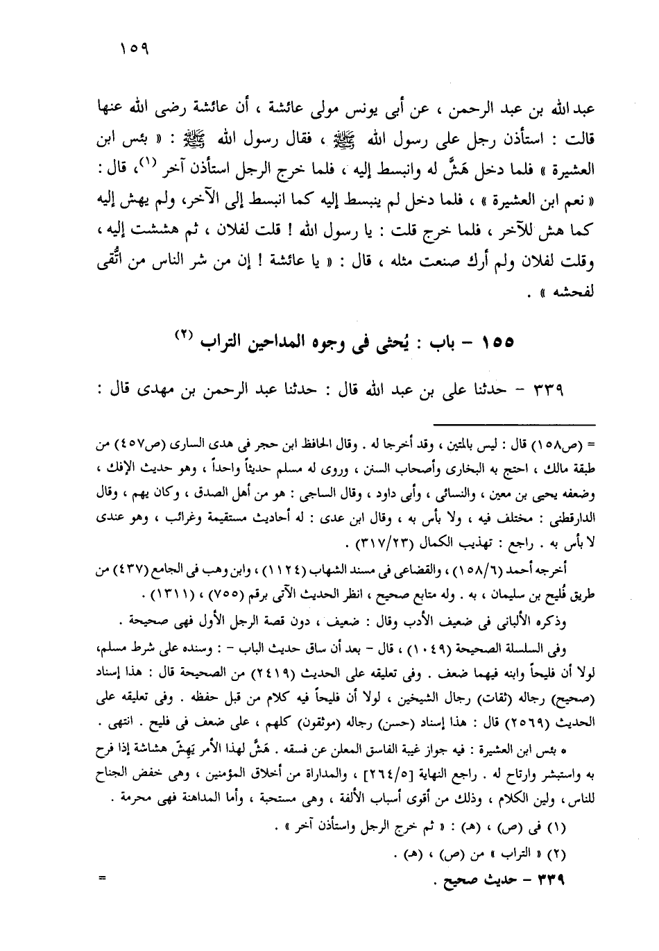 339- حَدثنا مُحَمَّدٍ، قَالَ: حَدثنا عَلِيُّ بْنُ عَبْدِ اللهِ، قَالَ: حَدثنا عَبْدُ الرَّحْمَنِ بْنُ مَهْدِيٍّ، قَالَ: حَدثنا سُفْيَانُ بْنُ سَعِيدٍ، عَنْ حَبِيبِ بْنِ أَبِي ثَابِتٍ، عَنْ مُجَاهِدٍ، عَنْ أَبِي مَعْمَرٍ قَالَ: قَامَ رَجُلٌ يُثْنِي عَلَى أَمِيرٍ مِنَ الأُمَرَاءِ، فَجَعَلَ الْمِقْدَادُ يَحْثِي فِي وَجْهِهِ التُّرَابَ، وَقَالَ: أَمَرَنَا رَسُولُ اللهِ صَلى الله عَلَيهِ وسَلم أَنْ نَحْثِيَ فِي وُجُوهِ الْمَدَّاحِينَ التُّرَابَ.