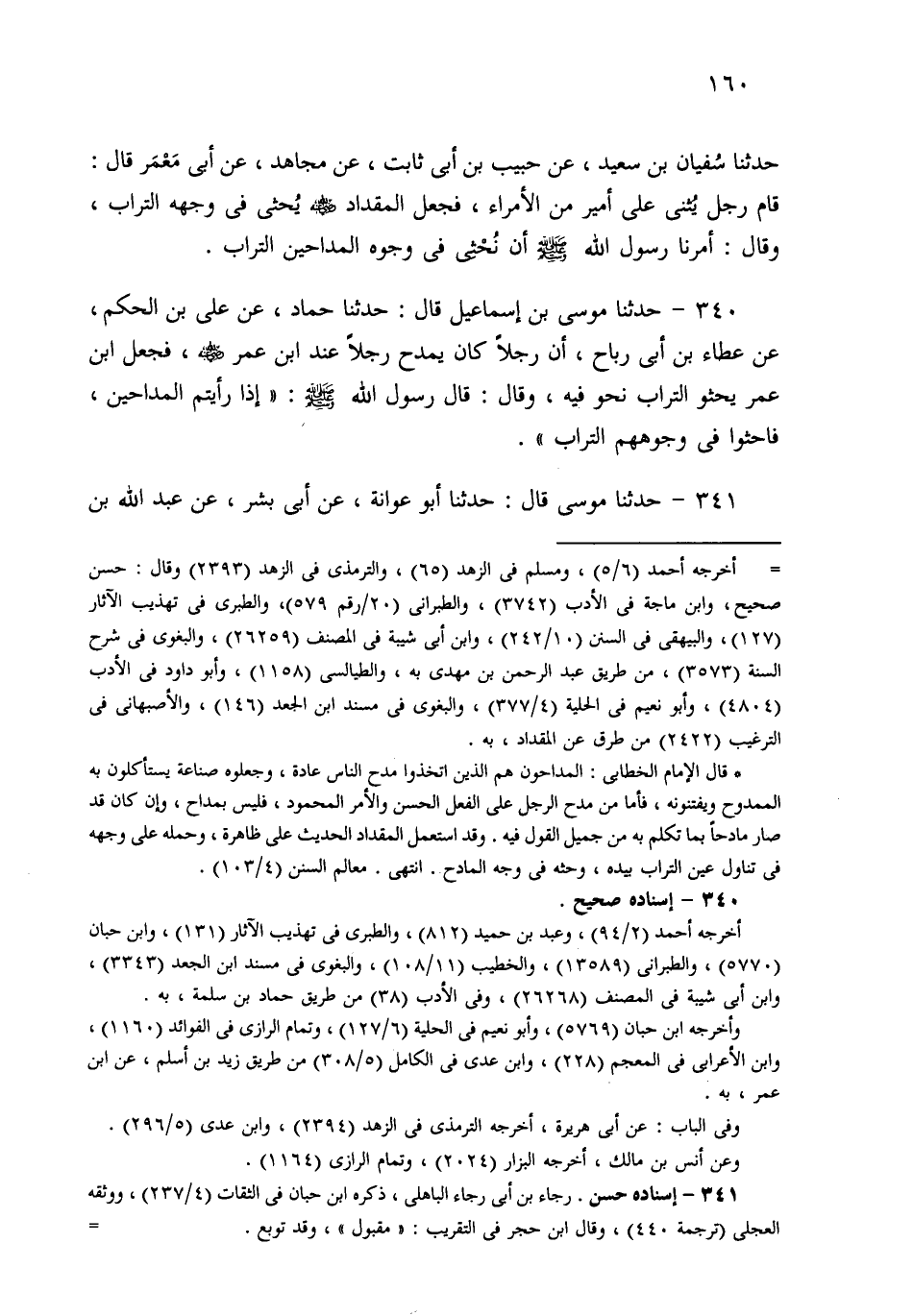 340- حَدثنا مُحَمَّدٍ، قَالَ: حَدثنا مُوسَى بْنُ إِسْمَاعِيلَ، قَالَ: حَدثنا حَمَّادٌ، عَنْ عَلِيِّ بْنِ الْحَكَمِ، عَنْ عَطَاءِ بْنِ أَبِي رَبَاحٍ، أَنَّ رَجُلاً كَانَ يَمْدَحُ رَجُلاً عِنْدَ ابْنِ عُمَرَ فَجَعَلَ ابْنُ عُمَرَ يَحْثُو التُّرَابَ نَحْوَ فِيهِ، وَقَالَ: قَالَ رَسُولُ اللهِ صَلى الله عَلَيهِ وسَلم: إِذَا رَأَيْتُمُ الْمَدَّاحِينَ فَاحْثُوا فِي وُجُوهِهِمُ التُّرَابَ.
