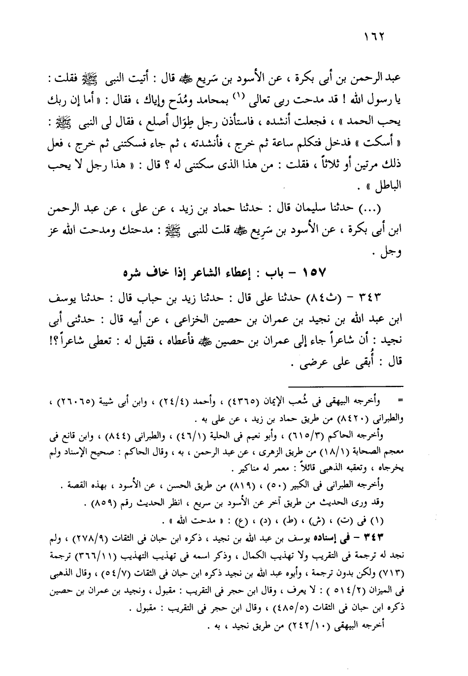343- حَدثنا مُحَمَّدٍ، قَالَ: حَدثنا عَلِيٌّ، قَالَ: حَدثنا زَيْدُ بْنُ حُبَابٍ، قَالَ: حَدثنا يُوسُفُ بْنُ عَبْدِ اللهِ بْنِ نُجَيْدِ بْنِ عِمْرَانَ بْنِ حُصَيْنٍ الْخُزَاعِيُّ قَالَ: حَدَّثَنِي أَبِي نُجَيْدٌ، أَنَّ شَاعِرًا جَاءَ إِلَى عِمْرَانَ بْنِ حُصَيْنٍ فَأَعْطَاهُ، فَقِيلَ لَهُ: تُعْطِي شَاعِرًا؟ فَقَالَ: أُبْقِي عَلَى عِرْضِي.