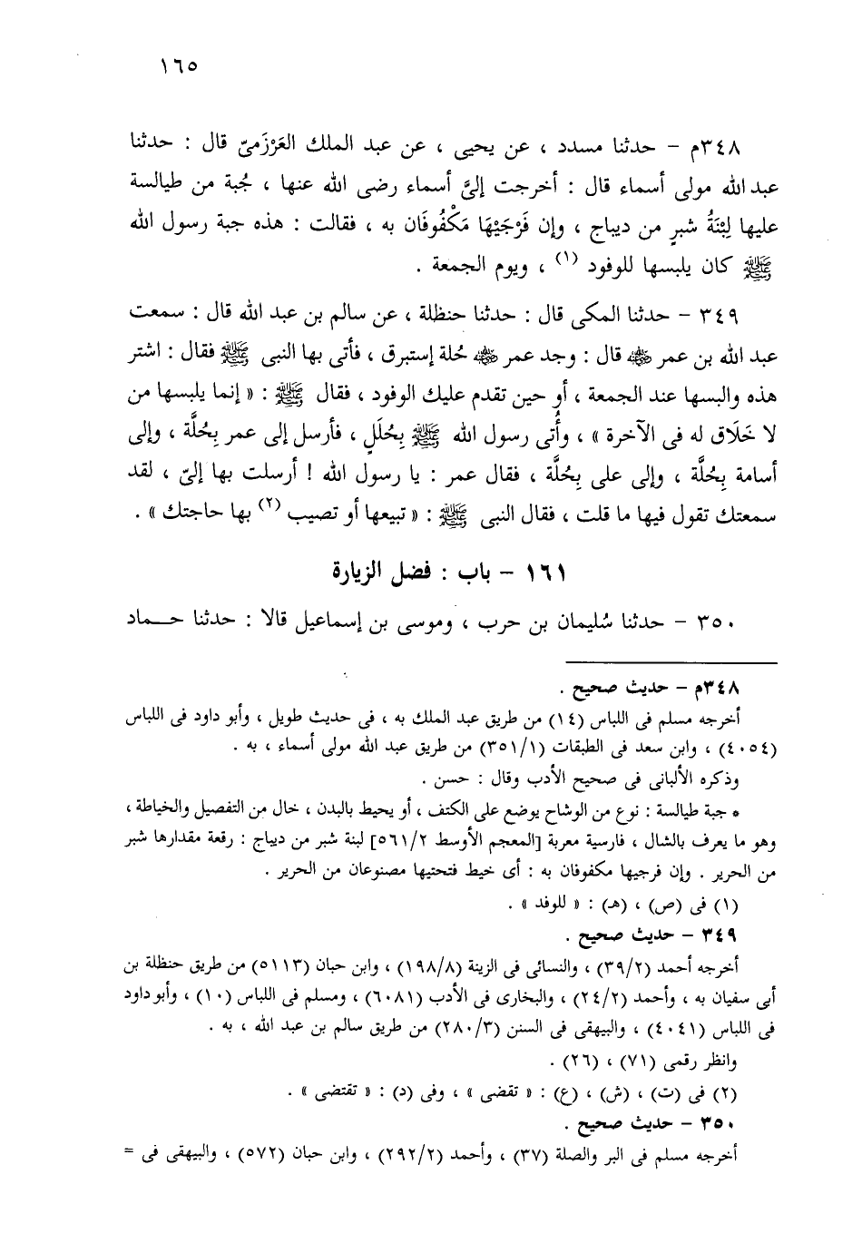348م- حَدثنا مُسَدَّدٌ، عَنْ يَحْيَى، عَنْ عَبْدِ الْمَلِكِ الْعَرْزَمِيِّ، قَالَ: حَدثنا عَبْدُ اللهِ مَوْلَى أَسْمَاءَ قَالَ: أَخْرَجَتْ إِلَيَّ أَسْمَاءُ جُبَّةً مِنْ طَيَالِسَةٍ عَلَيْهَا لَبِنَةُ شِبْرٍ مِنْ دِيبَاجٍ، وَإِنَّ فَرْجَيْهَا مَكْفُوفَانِ بِهِ، فَقَالَتْ: هَذِهِ جُبَّةُ رَسُولِ اللهِ صَلى الله عَلَيهِ وسَلم، كَانَ يَلْبَسُهَا لِلْوُفُودِ، وَيَوْمَ الْجُمُعَةِ.