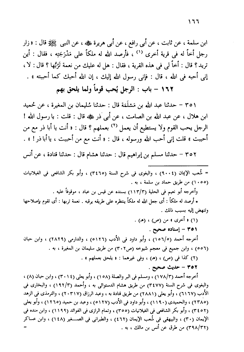 351- حَدثنا عَبْدُ اللهِ بْنُ مَسْلَمَةَ، قَالَ: حَدثنا سُلَيْمَانُ بْنُ الْمُغِيرَةِ، عَنْ حُمَيْدِ بْنِ هِلاَلٍ، عَنْ عَبْدِ اللهِ بْنِ الصَّامِتِ، عَنْ أَبِي ذَرٍّ قُلْتُ: يَا رَسُولَ اللهِ، الرَّجُلُ يُحِبُّ الْقَوْمَ وَلاَ يَسْتَطِيعُ أَنْ يَلْحَقَ بِعَمَلِهِمْ؟ قَالَ: أَنْتَ يَا أَبَا ذَرٍّ مَعَ مَنْ أَحْبَبْتَ، قُلْتُ: إِنِّي أُحِبُّ اللهَ وَرَسُولَهُ، قَالَ: أَنْتَ مَعَ مَنْ أَحْبَبْتَ يَا أَبَا ذَرٍّ.