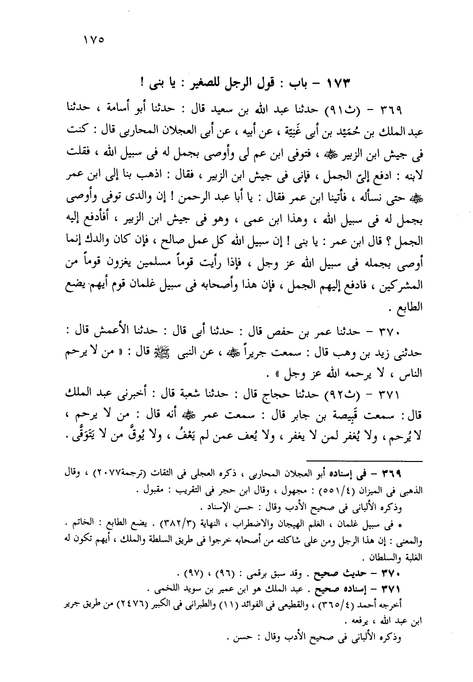 369- حَدثنا عَبْدُ اللهِ بْنُ سَعِيدٍ، قَالَ: حَدثنا أَبُو أُسَامَةَ، حَدثنا عَبْدُ الْمَلِكِ بْنُ حُمَيْدِ بْنِ أَبِي غَنِيَّةَ، عَنْ أَبِيهِ، عَنْ أَبِي الْعَجْلاَنِ الْمُحَارِبِيِّ قَالَ: كُنْتُ فِي جَيْشِ ابْنِ الزُّبَيْرِ، فَتُوُفِّيَ ابْنُ عَمٍّ لِي، وَأَوْصَى بِجَمَلٍ لَهُ فِي سَبِيلِ اللهِ، فَقُلْتُ لِابْنِهِ: ادْفَعْ إِلَيَّ الْجَمَلَ، فَإِنِّي فِي جَيْشِ ابْنِ الزُّبَيْرِ، فَقَالَ: اذْهَبْ بِنَا إِلَى ابْنِ عُمَرَ حَتَّى نَسْأَلَهُ، فَأَتَيْنَا ابْنَ عُمَرَ، فَقَالَ: يَا أَبَا عَبْدِ الرَّحْمَنِ، إِنَّ وَالِدِي تُوُفِّيَ، وَأَوْصَى بِجَمَلٍ لَهُ فِي سَبِيلِ اللهِ، وَهَذَا ابْنُ عَمِّي، وَهُوَ فِي جَيْشِ ابْنِ الزُّبَيْرِ، أَفَأَدْفَعُ إِلَيْهِ الْجَمَلَ؟ قَالَ ابْنُ عُمَرَ: يَا بُنَيَّ، إِنَّ سَبِيلَ اللهِ كُلُّ عَمَلٍ صَالِحٍ، فَإِنْ كَانَ وَالِدُكَ إِنَّمَا أَوْصَى بِجَمَلِهِ فِي سَبِيلِ اللهِ عَزَّ وَجَلَّ، فَإِذَا رَأَيْتَ قَوْمًا مُسْلِمِينَ يَغْزُونَ قَوْمًا مِنَ الْمُشْرِكِينَ، فَادْفَعْ إِلَيْهِمُ الْجَمَلَ، فَإِنْ هَذَا وَأَصْحَابَهُ فِي سَبِيلِ غِلْمَانِ قَوْمٍ أَيُّهُمْ يَضَعُ الطَّابَعَ.