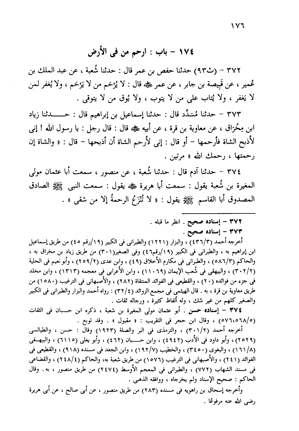 374- حَدثنا آدَمُ، قَالَ: حَدثنا شُعْبَةُ، عَنْ مَنْصُورٍ، سَمِعْتُ أَبَا عُثْمَانَ مَوْلَى الْمُغِيرَةِ بْنِ شُعْبَةَ يَقُولُ: سَمِعْتُ أَبَا هُرَيْرَةَ يَقُولُ: سَمِعْتُ النَّبِيَّ صَلى الله عَلَيهِ وسَلم الصَّادِقَ الْمَصْدُوقَ أَبَا الْقَاسِمِ صَلى الله عَلَيهِ وسَلم يَقُولُ: لاَ تُنْزَعُ الرَّحْمَةُ إِلا مِنْ شَقِيٍّ.