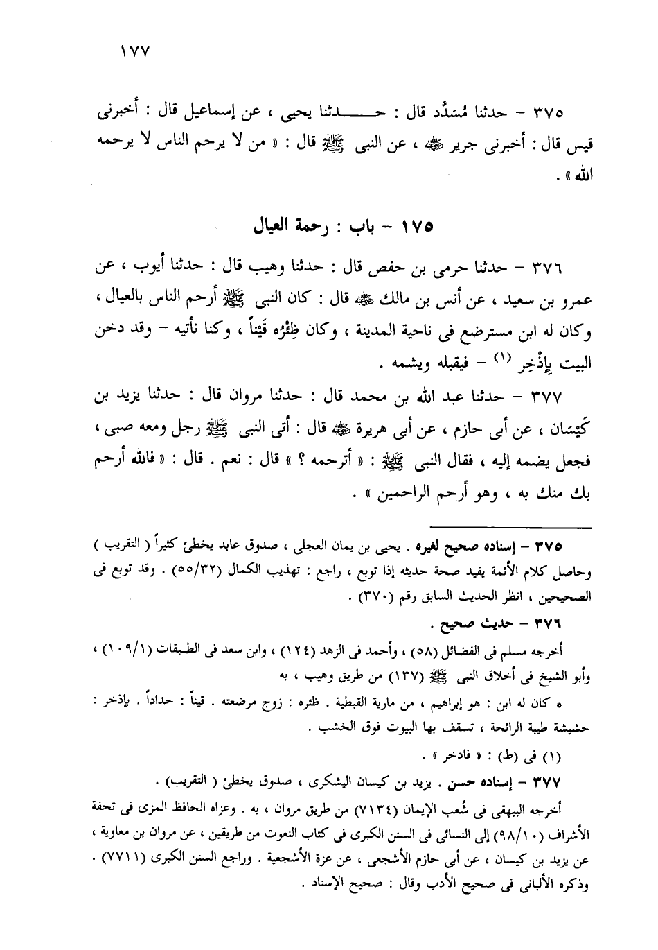 377- حَدثنا عَبْدُ اللهِ بْنُ مُحَمَّدٍ، قَالَ: حَدثنا مَرْوَانُ، قَالَ: حَدثنا يَزِيدُ بْنُ كَيْسَانَ، عَنْ أَبِي حَازِمٍ، عَنْ أَبِي هُرَيْرَةَ قَالَ: أَتَى النَّبِيَّ صَلى الله عَلَيهِ وسَلم رَجُلٌ وَمَعَهُ صَبِيٌّ، فَجَعَلَ يَضُمُّهُ إِلَيْهِ، فَقَالَ النَّبِيُّ صَلى الله عَلَيهِ وسَلم: أَتَرْحَمُهُ؟ قَالَ: نَعَمْ، قَالَ: فَاللهُ أَرْحَمُ بِكَ مِنْكَ بِهِ، وَهُوَ أَرْحَمُ الرَّاحِمِينَ.