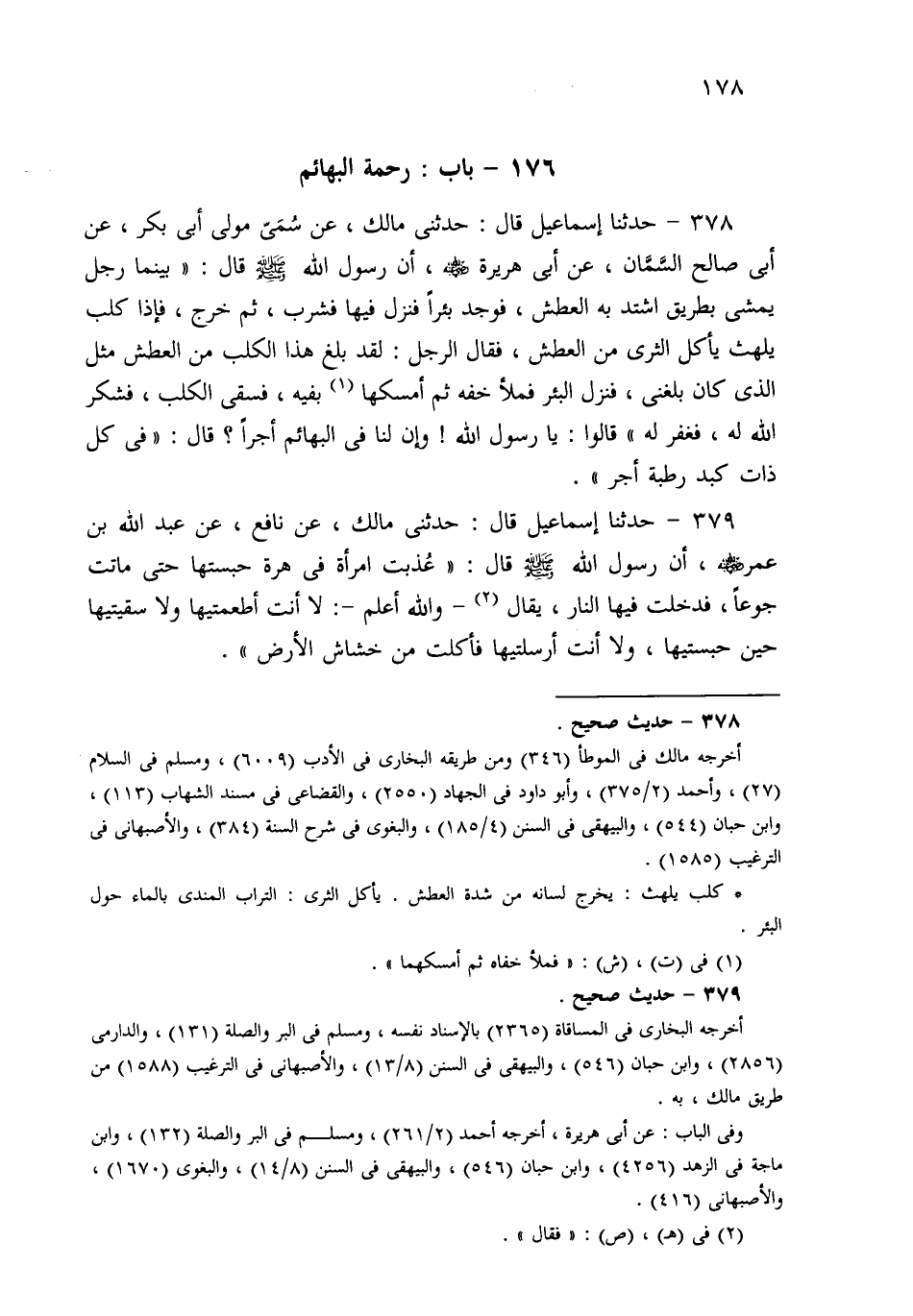 378- حَدثنا إِسْمَاعِيلُ قَالَ: حَدَّثَنِي مَالِكٌ، عَنْ سُمَيٍّ مَوْلَى أَبِي بَكْرٍ، عَنْ أَبِي صَالِحٍ السَّمَّانِ، عَنْ أَبِي هُرَيْرَةَ، أَنَّ رَسُولَ اللهِ صَلى الله عَلَيهِ وسَلم قَالَ: بَيْنَمَا رَجُلٌ يَمْشِي بِطَرِيقٍ اشْتَدَّ بِهِ الْعَطَشُ، فَوَجَدَ بِئْرًا فَنَزَلَ فِيهَا، فَشَرِبَ ثُمَّ خَرَجَ، فَإِذَا كَلْبٌ يَلْهَثُ، يَأْكُلُ الثَّرَى مِنَ الْعَطَشِ، فَقَالَ الرَّجُلُ: لَقَدْ بَلَغَ هَذَا الْكَلْبَ مِنَ الْعَطَشِ مِثْلُ الَّذِي كَانَ بَلَغَنِي، فَنَزَلَ الْبِئْرَ فَمَلَأَ خُفَّاهُ، ثُمَّ أَمْسَكَهَا بِفِيهِ، فَسَقَى الْكَلْبَ، فَشَكَرَ اللهُ لَهُ، فَغَفَرَ لَهُ، قَالُوا: يَا رَسُولَ اللهِ، وَإِنَّ لَنَا فِي الْبَهَائِمِ أَجْرًا؟ قَالَ: فِي كُلِّ ذَاتِ كَبِدٍ رَطْبَةٍ أَجْرٌ.