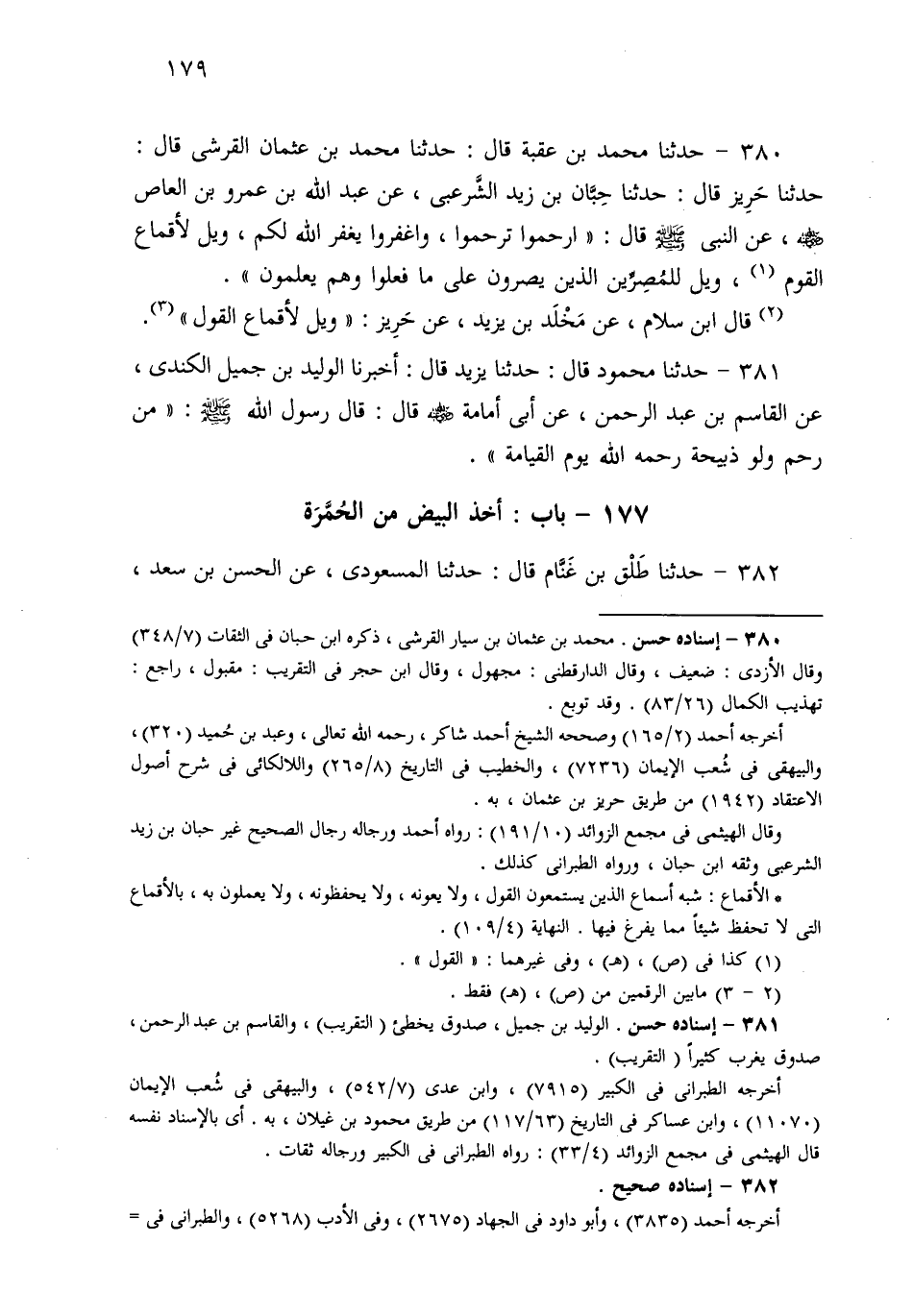380- حَدثنا مُحَمَّدُ بْنُ عُقْبَةَ، قَالَ: حَدثنا مُحَمَّدُ بْنُ عُثْمَانَ الْقُرَشِيُّ، قَالَ: حَدثنا حَرِيزٌ، قَالَ: حَدثنا حِبَّانُ بْنُ زَيْدٍ الشَّرْعَبِيُّ، عَنْ عَبْدِ اللهِ بْنِ عَمْرِو بْنِ الْعَاصِ، عَنِ النَّبِيِّ صَلى الله عَلَيهِ وسَلم قَالَ: ارْحَمُوا تُرْحَمُوا، وَاغْفِرُوا يَغْفِرُ اللهُ لَكُمْ، وَيْلٌ لأَقْمَاعِ الْقَوْلِ، وَيْلٌ لِلْمُصِرِّينَ الَّذِينَ يُصِرُّونَ عَلَى مَا فَعَلُوا وَهُمْ يَعْلَمُونَ.