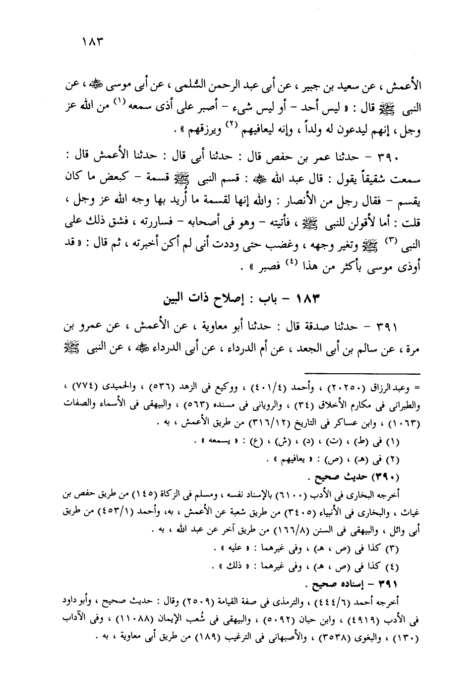 391- حَدثنا صَدَقَةُ، قَالَ: حَدثنا أَبُو مُعَاوِيَةَ، عَنِ الأَعْمَشِ، عَنْ عَمْرِو بْنِ مُرَّةَ، عَنْ سَالِمِ بْنِ أَبِي الْجَعْدِ، عَنْ أُمِّ الدَّرْدَاءِ، عَنْ أَبِي الدَّرْدَاءِ، عَنِ النَّبِيِّ صَلى الله عَلَيهِ وسَلم قَالَ: أَلاَ أُنَبِّئُكُمْ بِدَرَجَةٍ أَفْضَلَ مِنَ الصَّلاَةِ وَالصِّيَامِ وَالصَّدَقَةِ؟ قَالُوا: بَلَى، قَالَ: صَلاَحُ ذَاتِ الْبَيْنِ، وَفَسَادُ ذَاتِ الْبَيْنِ هِيَ الْحَالِقَةُ.