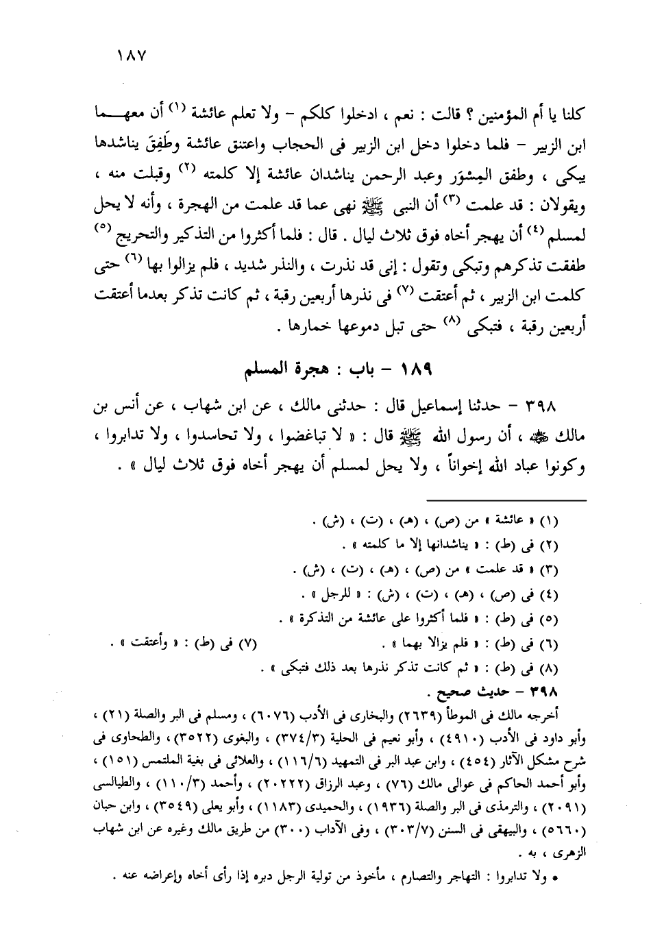 398- حَدثنا إِسْمَاعِيلُ قَالَ: حَدَّثَنِي مَالِكٌ، عَنِ ابْنِ شِهَابٍ، عَنْ أَنَسِ بْنِ مَالِكٍ، أَنَّ رَسُولَ اللهِ صَلى الله عَلَيهِ وسَلم قَالَ: لاَ تَبَاغَضُوا، وَلاَ تَحَاسَدُوا، وَلاَ تَدَابَرُوا، وَكُونُوا عِبَادَ اللهِ إِخْوَانًا، وَلاَ يَحِلُّ لِمُسْلِمٍ أَنْ يَهْجُرَ أَخَاهُ فَوْقَ ثَلاَثِ لَيَالٍ.