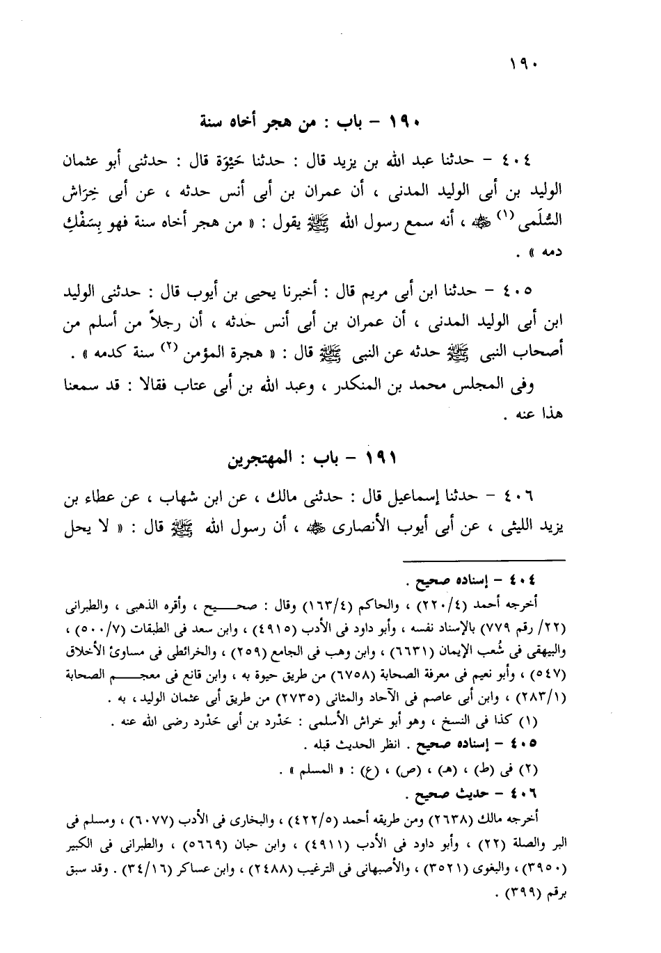 404- حَدثنا عَبْدُ اللهِ بْنُ يَزِيدَ، قَالَ: حَدثنا حَيْوَةُ قَالَ: حَدَّثَنِي أَبُو عُثْمَانَ الْوَلِيدُ بْنُ أَبِي الْوَلِيدِ الْمَدَنِيُّ، أَنَّ عِمْرَانَ بْنَ أَبِي أَنَسٍ حَدَّثَهُ، عَنْ أَبِي خِرَاشٍ السُّلَمِيِّ، أَنَّهُ سَمِعَ رَسُولَ اللهِ صَلى الله عَلَيهِ وسَلم يَقُولُ: مَنْ هَجَرَ أَخَاهُ سَنَةً، فَهُوَ كَسَفْكِ دَمِهِ.