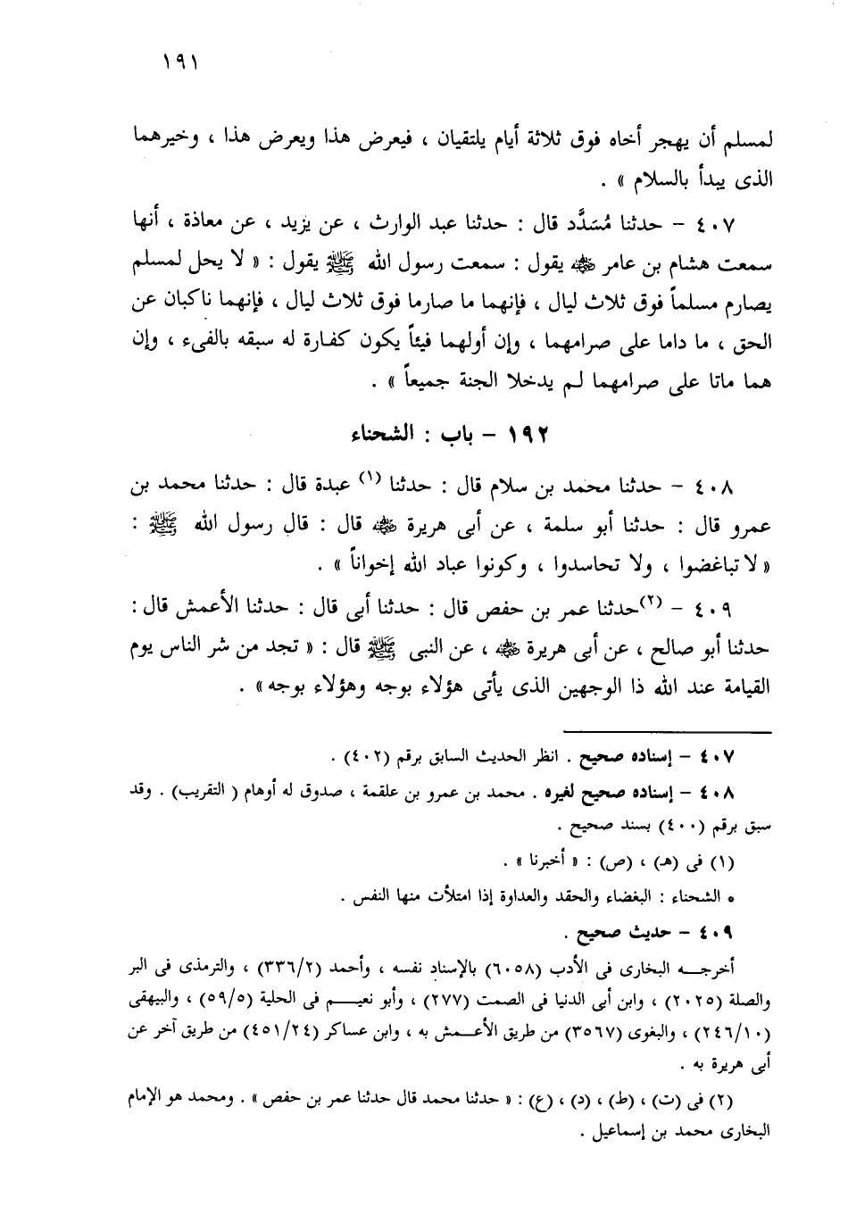 407- حَدثنا مُسَدَّدٌ، قَالَ: حَدثنا عَبْدُ الْوَارِثِ، عَنْ يَزِيدَ، عَنْ مُعَاذَةَ، أَنَّهَا سَمِعَتْ هِشَامَ بْنَ عَامِرٍ يَقُولُ: سَمِعْتُ رَسُولَ اللهِ صَلى الله عَلَيهِ وسَلم يَقُولُ: لاَ يَحِلُّ لِمُسْلِمٍ أَنْ يُصَارِمَ مُسْلِمًا فَوْقَ ثَلاَثِ لَيَالٍ، فَإِنَّهُمَا مَا صَارَمَا فَوْقَ ثَلاَثِ لَيَالٍ، فَإِنَّهُمَا نَاكِبَانِ عَنِ الْحَقِّ مَا دَامَا عَلَى صِرَامِهِمَا، وَإِنَّ أَوَّلَهُمَا فَيْئًا يَكُونُ كَفَّارَةً لَهُ سَبْقُهُ بِالْفَيْءِ، وَإِنْ هُمَا مَاتَا عَلَى صِرَامِهِمَا لَمْ يَدْخُلاَ الْجَنَّةَ جَمِيعًا.