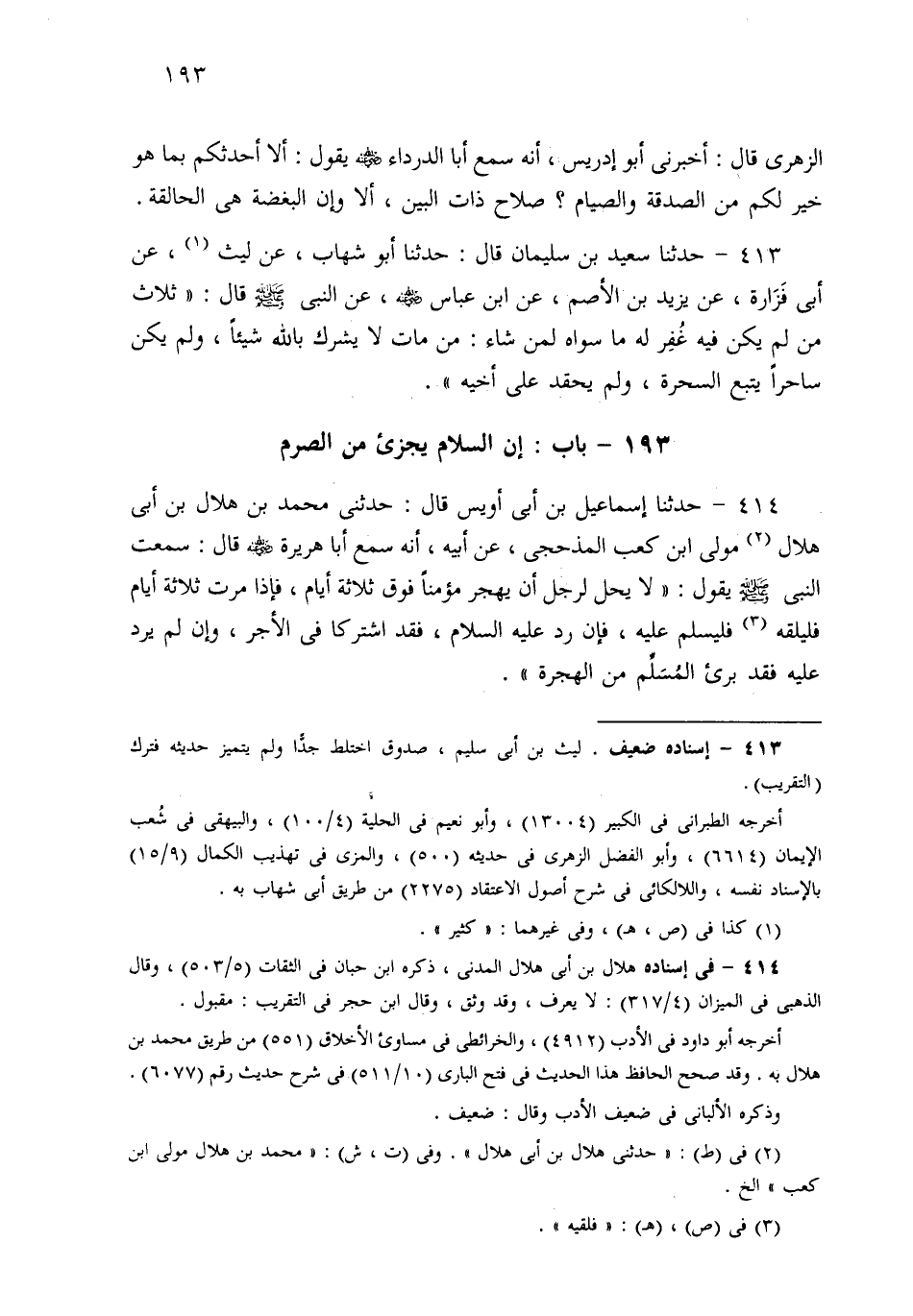 414- حَدثنا إِسْمَاعِيلُ بْنُ أَبِي أُوَيْسٍ قَالَ: حَدَّثَنِي مُحَمَّدُ بْنُ هِلاَلِ بْنِ أَبِي هِلاَلٍ مَوْلَى ابْنِ كَعْبٍ الْمَذْحِجِيِّ، عَنْ أَبِيهِ، أَنَّهُ سَمِعَ أَبَا هُرَيْرَةَ قَالَ: سَمِعْتُ النَّبِيَّ صَلى الله عَلَيهِ وسَلم يَقُولُ: لاَ يَحِلُّ لِرَجُلٍ أَنْ يَهْجُرَ مُؤْمِنًا فَوْقَ ثَلاَثَةِ أَيَّامٍ، فَإِذَا مَرَّتْ ثَلاَثَةُ أَيَّامٍ فَلْيَلْقَهُ فَلْيُسَلِّمْ عَلَيْهِ، فَإِنْ رَدَّ عَلَيْهِ السَّلاَمَ فَقَدِ اشْتَرَكَا فِي الأَجْرِ، وَإِنْ لَمْ يَرُدَّ عَلَيْهِ فَقَدْ بَرِئ الْمُسْلِمُ مِنَ الْهِجْرَةِ.