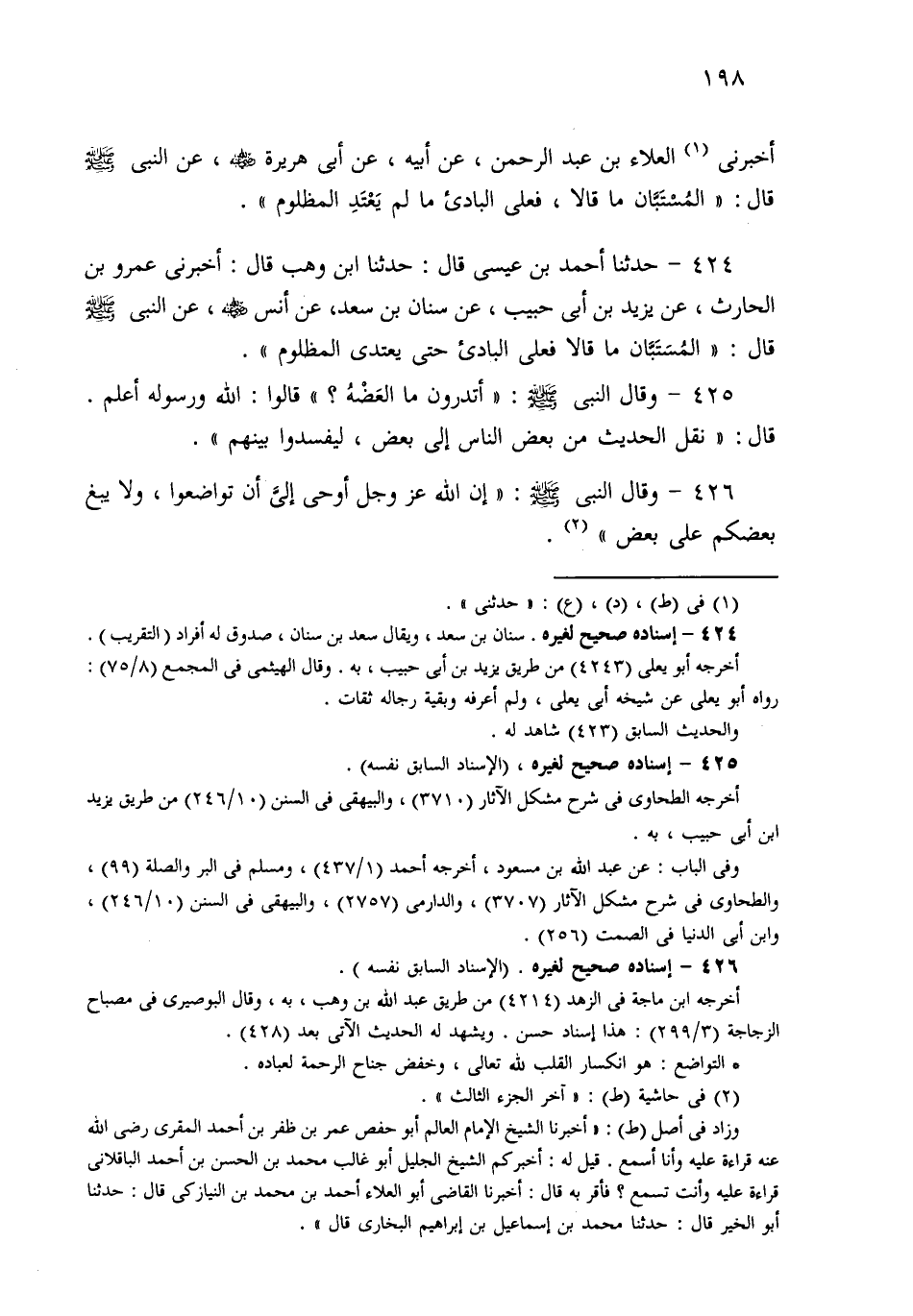 424- حَدثنا أَحْمَدُ بْنُ عِيسَى، قَالَ: حَدثنا ابْنُ وَهْبٍ قَالَ: أَخْبَرَنِي عَمْرُو بْنُ الْحَارِثِ، عَنْ يَزِيدَ بْنِ أَبِي حَبِيبٍ، عَنْ سِنَانِ بْنِ سَعْدٍ، عَنْ أَنَسٍ، عَنِ النَّبِيِّ صَلى الله عَلَيهِ وسَلم قَالَ: الْمُسْتَبَّانِ مَا قَالاَ، فَعَلَى الْبَادِئِ، حَتَّى يَعْتَدِيَ الْمَظْلُومُ.