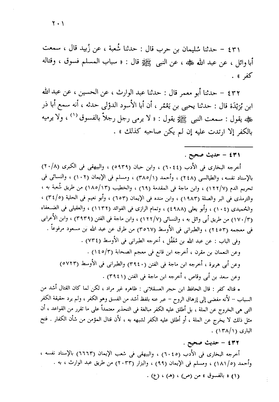 431- حَدثنا سُلَيْمَانُ بْنُ حَرْبٍ، قَالَ: حَدثنا شُعْبَةُ، عَنْ زُبَيْدٍ قَالَ: سَمِعْتُ أَبَا وَائِلٍ، عَنْ عَبْدِ اللهِ، عَنِ النَّبِيِّ صَلى الله عَلَيهِ وسَلم: سِبَابُ الْمُسْلِمِ فُسُوقٌ، وَقِتَالُهُ كُفْرٌ.