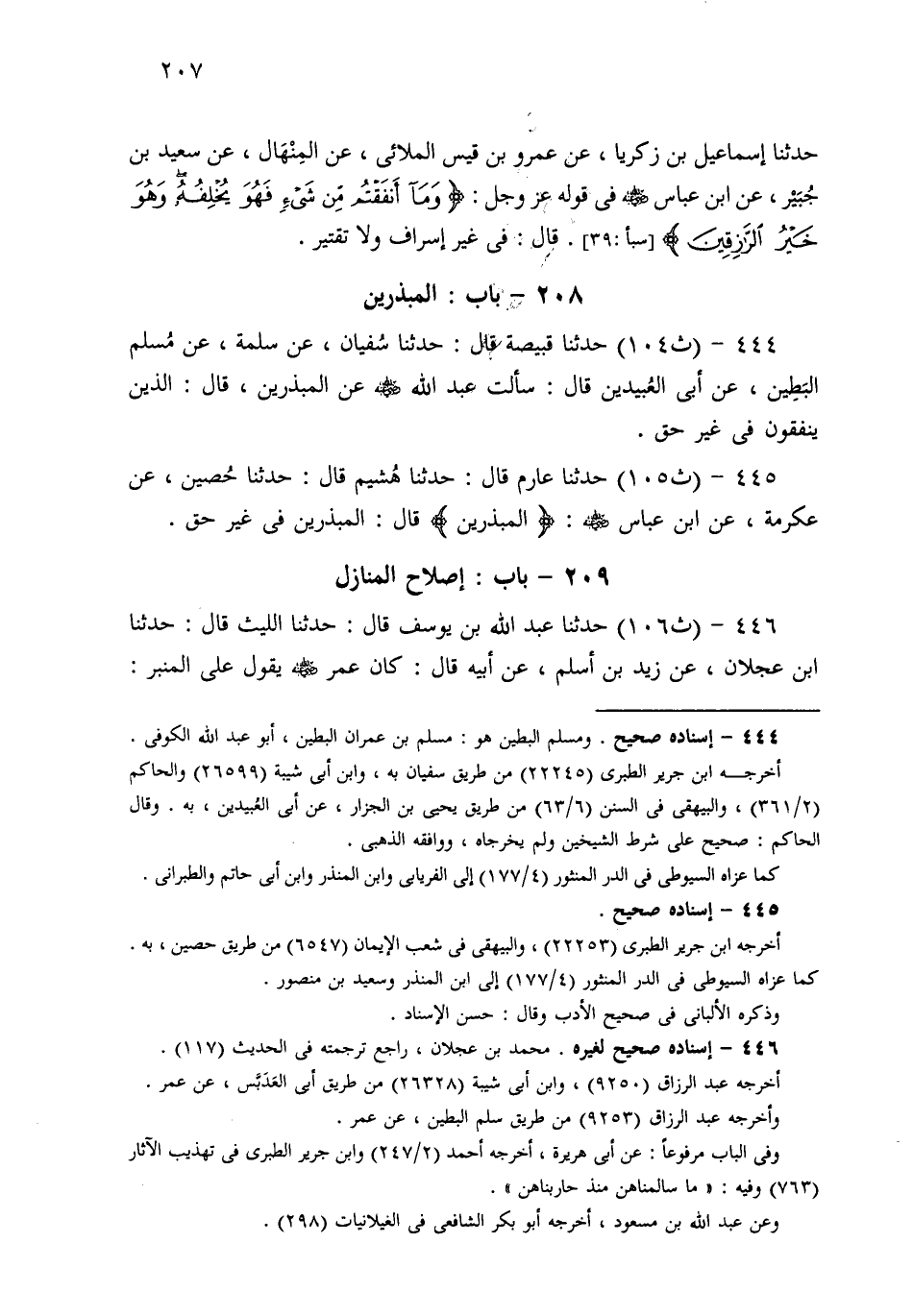 444- حَدثنا قَبِيصَةُ، قَالَ: حَدثنا سُفْيَانُ، عَنْ سَلَمَةَ، عَنْ مُسْلِمٍ الْبَطِينِ، عَنْ أَبِي الْعُبَيْدَيْنِ قَالَ: سَأَلْتُ عَبْدَ اللهِ عَنِ الْمُبَذِّرِينَ، قَالَ: الَّذِينَ يُنْفِقُونَ فِي غَيْرِ حَقٍّ.