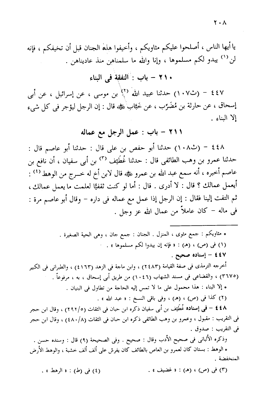 447- حَدثنا عُبَيْدُ اللهِ بْنُ مُوسَى (1)، عَنْ إِسْرَائِيلَ، عَنْ أَبِي إِسْحَاقَ، عَنْ حَارِثَةَ بْنِ مُضَرِّبٍ، عَنْ خَبَّابٍ قَالَ: إِنَّ الرَّجُلَ لَيُؤْجَرُ فِي كُلِّ شَيْءٍ، إِلا الْبِنَاءَ.