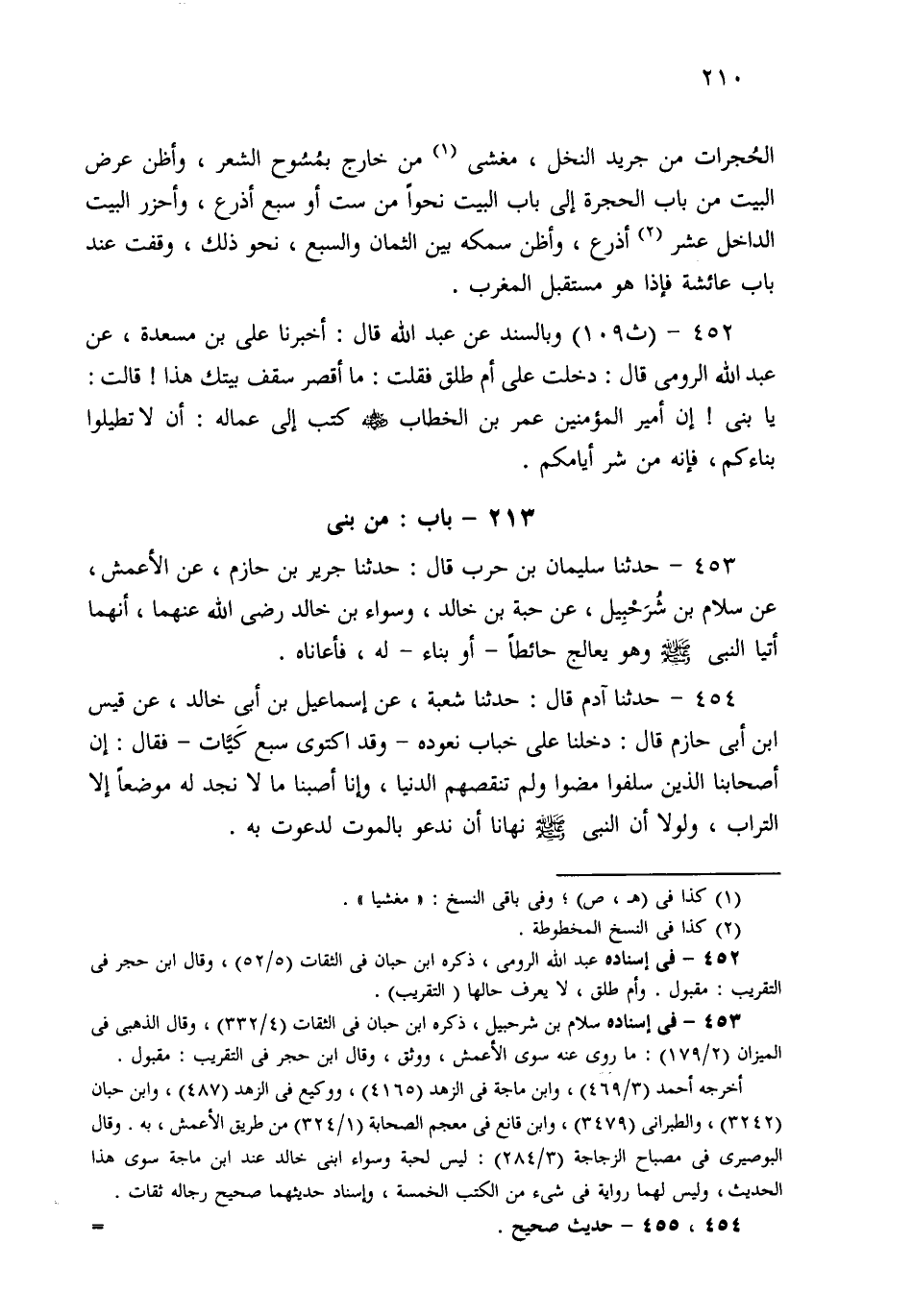452- وَبِالسَّنَدِ عَنْ عَبْدِ اللهِ، قَالَ: أَخْبَرَنَا عَلِيُّ بْنُ مَسْعَدَةَ، عَنْ عَبْدِ اللهِ الرُّومِيِّ قَالَ: دَخَلْتُ عَلَى أُمِّ طَلْقٍ فَقُلْتُ: مَا أَقْصَرَ سَقْفَ بَيْتِكِ هَذَا؟ قَالَتْ: يَا بُنَيَّ إِنَّ أَمِيرَ الْمُؤْمِنِينَ عُمَرَ بْنَ الْخَطَّابِ رَضِيَ اللهُ عَنْهُ كَتَبَ إِلَى عُمَّالِهِ: أَنْ لاَ تُطِيلُوا بِنَاءَكُمْ، فَإِنَّهُ مِنْ شَرِّ أَيَّامِكُمْ.