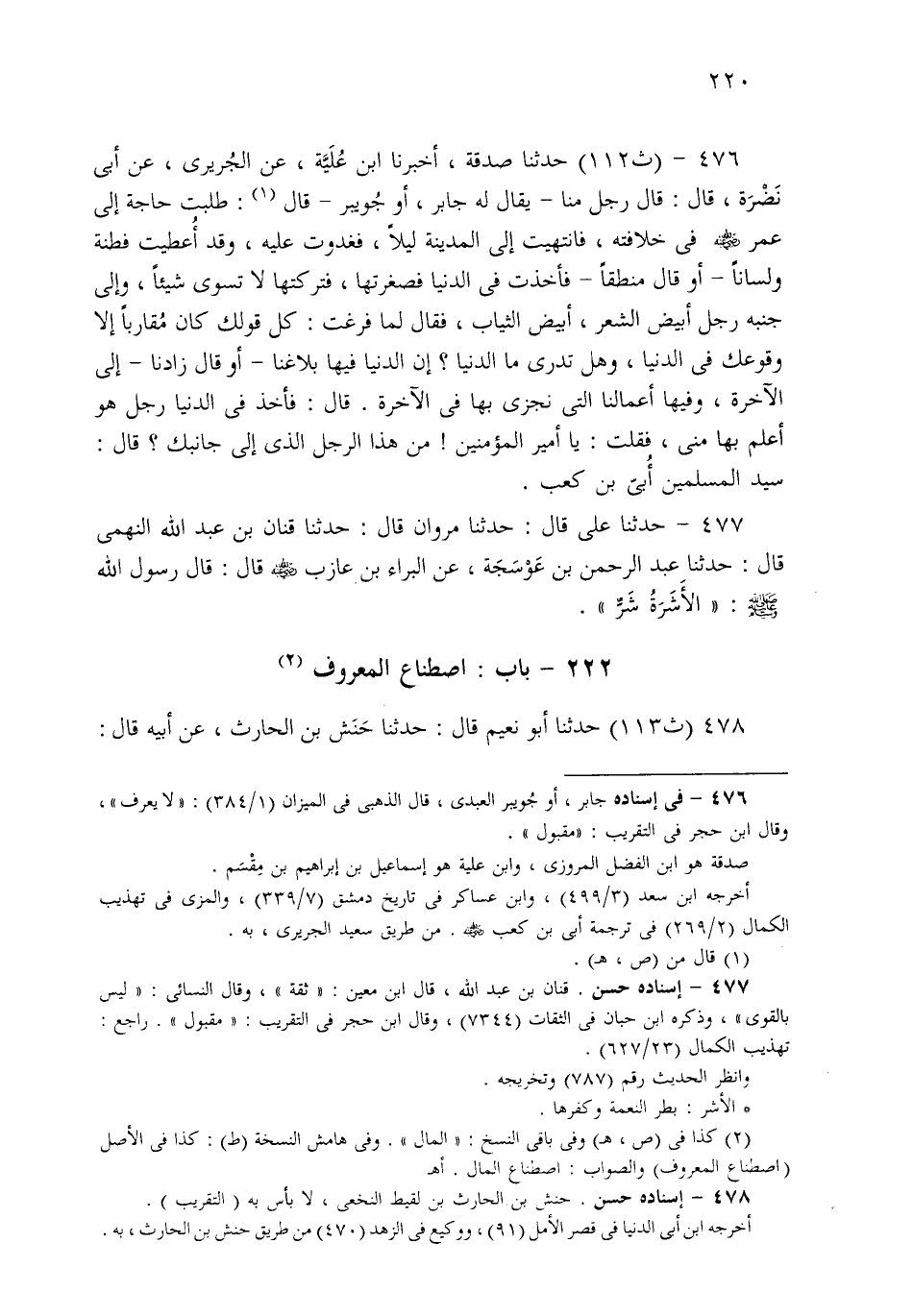 476- حَدثنا صَدَقَةُ، أَخْبَرَنَا ابْنُ عُلَيَّةَ، عَنِ الْجُرَيْرِيِّ، عَنْ أَبِي نَضْرَةَ: قَالَ رَجُلٌ مِنَّا يُقَالُ لَهُ: جَابِرٌ أَوْ جُوَيْبِرٌ: طَلَبْتُ حَاجَةً إِلَى عُمَرَ فِي خِلاَفَتِهِ، فَانْتَهَيْتُ إِلَى الْمَدِينَةِ لَيْلاً، فَغَدَوْتُ عَلَيْهِ، وَقَدْ أُعْطِيتُ فِطْنَةً وَلِسَانًا، أَوْ قَالَ: مِنْطَقًا، فَأَخَذْتُ فِي الدُّنْيَا فَصَغَّرْتُهَا، فَتَرَكْتُهَا لاَ تَسْوَى شَيْئًا، وَإِلَى جَنْبِهِ رَجُلٌ أَبْيَضُ الشَّعْرِ أَبْيَضُ الثِّيَابِ، فَقَالَ لَمَّا فَرَغْتُ: كُلُّ قَوْلِكَ كَانَ مُقَارِبًا، إِلاَّ وَقُوعَكَ فِي الدُّنْيَا، وَهَلْ تَدْرِي مَا الدُّنْيَا؟ إِنَّ الدُّنْيَا فِيهَا بَلاَغُنَا، أَوْ قَالَ: زَادُنَا، إِلَى الآخِرَةِ، وَفِيهَا أَعْمَالُنَا الَّتِي نُجْزَى بِهَا فِي الآخِرَةِ، قَالَ: فَأَخَذَ فِي الدُّنْيَا رَجُلٌ هُوَ أَعْلَمُ بِهَا مِنِّي، فَقُلْتُ: يَا أَمِيرَ الْمُؤْمِنِينَ، مَنْ هَذَا الرَّجُلُ الَّذِي إِلَى جَنْبِكَ؟ قَالَ: سَيِّدُ الْمُسْلِمِينَ أُبَيُّ بْنُ كَعْبٍ.
