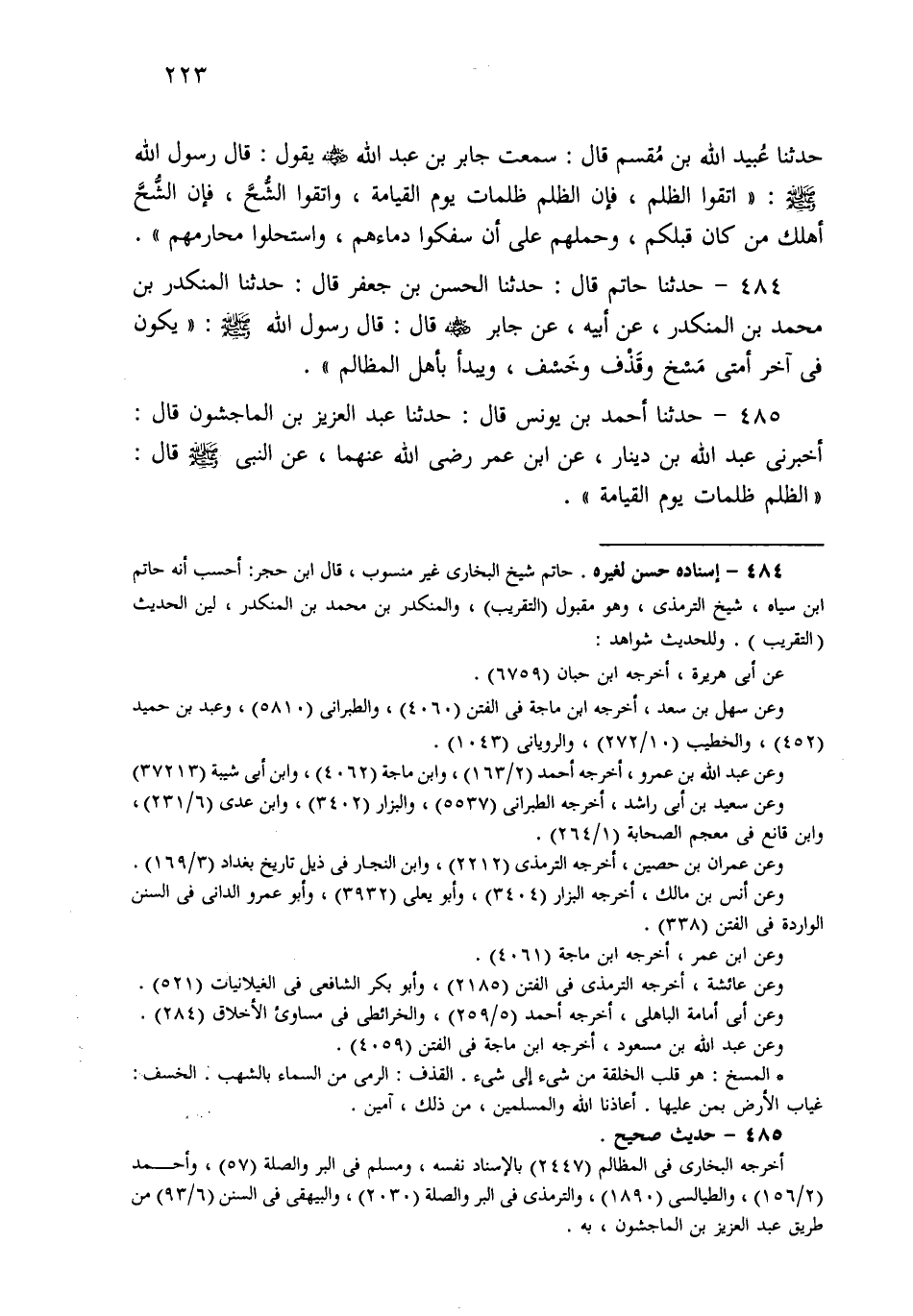 484- حَدثنا حَاتِمٌ، قَالَ: حَدثنا الْحَسَنُ بْنُ جَعْفَرٍ، قَالَ: حَدثنا الْمُنْكَدِرُ بْنُ مُحَمَّدِ بْنِ الْمُنْكَدِرِ، عَنْ أَبِيهِ، عَنْ جَابِرٍ قَالَ: قَالَ رَسُولُ اللهِ صَلى الله عَلَيهِ وسَلم: يَكُونُ فِي آخِرِ أُمَّتِي مَسْخٌ، وَقَذْفٌ، وَخَسْفٌ، وَيُبْدَأُ بِأَهْلِ الْمَظَالِمِ.