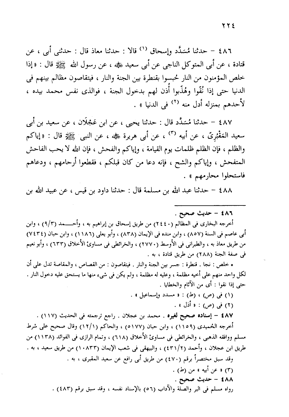 486- حَدثنا مُسَدَّدٌ، وَإِسْحَاقُ قَالاَ: حَدثنا مُعَاذٌ قَالَ: حَدَّثَنِي أَبِي، عَنْ قَتَادَةَ، عَنْ أَبِي الْمُتَوَكِّلِ النَّاجِيِّ، عَنْ أَبِي سَعِيدٍ، عَنْ رَسُولِ اللهِ صَلى الله عَلَيهِ وسَلم قَالَ: إِذَا خَلَصَ الْمُؤْمِنُونَ مِنَ النَّارِ حُبِسُوا بِقَنْطَرَةٍ بَيْنَ الْجَنَّةِ وَالنَّارِ، فَيَتَقَاصُّونَ مَظَالِمَ بَيْنَهُمْ فِي الدُّنْيَا، حَتَّى إِذَا نُقُّوا وَهُذِّبُوا، أُذِنَ لَهُمْ بِدُخُولِ الْجَنَّةِ، فَوَالَّذِي نَفْسُ مُحَمَّدٍ بِيَدِهِ، لَأَحَدُهُمْ بِمَنْزِلِهِ أَدَلُّ مِنْهُ فِي الدُّنْيَا.