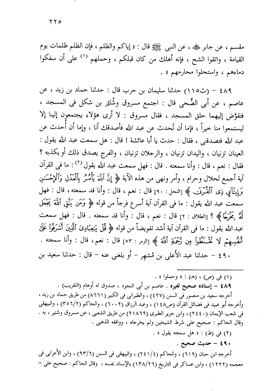 489- حَدثنا سُلَيْمَانُ بْنُ حَرْبٍ، قَالَ: حَدثنا حَمَّادُ بْنُ زَيْدٍ، عَنْ عَاصِمٍ، عَنْ أَبِي الضُّحَى قَالَ: اجْتَمَعَ مَسْرُوقٌ وَشُتَيْرُ بْنُ شَكَلٍ فِي الْمَسْجِدِ، فَتَقَوَّضَ إِلَيْهِمَا حِلَقُ الْمَسْجِدِ، فَقَالَ مَسْرُوقٌ: لاَ أَرَى هَؤُلاَءِ يَجْتَمِعُونَ إِلَيْنَا إِلاَّ لِيَسْتَمِعُوا مِنَّا خَيْرًا، فَإِمَّا أَنْ تُحَدِّثَ عَنْ عَبْدِ اللهِ فَأُصَدِّقَكَ أَنَا، وَإِمَّا أَنْ أُحَدِّثَ عَنْ عَبْدِ اللهِ فَتُصَدِّقَنِي؟ فَقَالَ: حَدِّثْ يَا أَبَا عَائِشَةَ، قَالَ: هَلْ سَمِعْتَ عَبْدَ اللهِ يَقُولُ: الْعَيْنَانِ يَزْنِيَانِ، وَالْيَدَانِ يَزْنِيَانِ، وَالرِّجْلاَنِ يَزْنِيَانِ، وَالْفَرْجُ يُصَدِّقُ ذَلِكَ أَوْ يُكَذِّبُهُ؟ فَقَالَ: نَعَمْ، قَالَ: وَأَنَا سَمِعْتُهُ، قَالَ: فَهَلْ سَمِعْتَ عَبْدَ اللهِ يَقُولُ: مَا فِي الْقُرْآنِ آيَةٌ أَجْمَعَ لِحَلاَلٍ وَحَرَامٍ وَأَمْرٍ وَنَهْيٍ، مِنْ هَذِهِ الآيَةِ: {إِنَّ اللهَ يَأْمُرُ بِالْعَدْلِ وَالإِحْسَانِ وَإِيتَاءِ ذِي الْقُرْبَى}؟ قَالَ: نَعَمْ، قَالَ: وَأَنَا قَدْ سَمِعْتُهُ، قَالَ: فَهَلْ سَمِعْتَ عَبْدَ اللهِ يَقُولُ: مَا فِي الْقُرْآنِ آيَةٌ أَسْرَعَ فَرَجًا مِنْ قَوْلِهِ: {وَمَنْ يَتَّقِ اللهَ يَجْعَلْ لَهُ مَخْرَجًا}؟ قَالَ: نَعَمْ، قَالَ: وَأَنَا قَدْ سَمِعْتُهُ، قَالَ: فَهَلْ سَمِعْتَ عَبْدَ اللهِ يَقُولُ: مَا فِي الْقُرْآنِ آيَةٌ أَشَدَّ تَفْوِيضًا مِنْ قَوْلِهِ: {يَا عِبَادِيَ الَّذِينَ أَسْرَفُوا عَلَى أَنْفُسِهِمْ لاَ تَقْنَطُوا} مِنْ رَحْمَةِ اللهِ؟ قَالَ: نَعَمْ، قَالَ: وَأَنَا سَمِعْتُهُ.