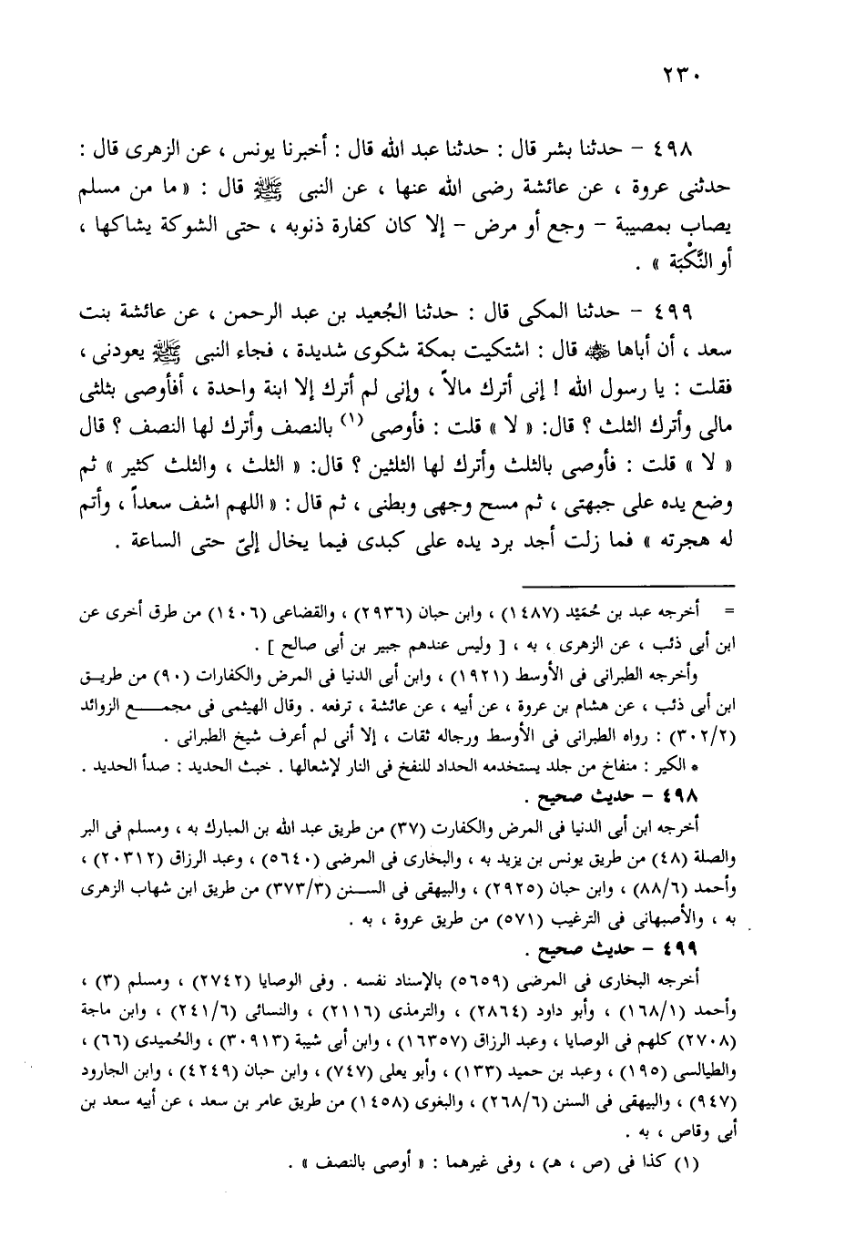 499- حَدثنا الْمَكِّيُّ، قَالَ: حَدثنا الْجُعَيْدُ بْنُ عَبْدِ الرَّحْمَنِ، عَنْ عَائِشَةَ بِنْتِ سَعْدٍ، أَنَّ أَبَاهَا قَالَ: اشْتَكَيْتُ بِمَكَّةَ شَكْوَى شَدِيدَةً، فَجَاءَ النَّبِيُّ صَلى الله عَلَيهِ وسَلم يَعُودُنِي، فَقُلْتُ: يَا رَسُولَ اللهِ، إِنِّي أَتْرُكُ مَالاً، وَإِنِّي لَمْ أَتْرُكْ إِلاَّ ابْنَةً وَاحِدَةً، أَفَأُوصِي بِثُلُثَيْ مَالِي، وَأَتْرُكُ الثُّلُثَ؟ قَالَ: لاَ، قَالَ: أُوصِي النِّصْفَ، وَأَتْرُكُ لَهَا النِّصْفَ؟ قَالَ: لاَ، قَالَ: فَأَوْصِي بِالثُّلُثِ، وَأَتْرُكُ لَهَا الثُّلُثَيْنِ؟ قَالَ: الثُّلُثُ، وَالثُّلُثُ كَثِيرٌ، ثُمَّ وَضَعَ يَدَهُ عَلَى جَبْهَتِي، ثُمَّ مَسَحَ وَجْهِي وَبَطْنِي، ثُمَّ قَالَ: اللَّهُمَّ اشْفِ سَعْدًا، وَأَتِمَّ لَهُ هِجْرَتَهُ، فَمَا زِلْتُ أَجِدُ بَرْدَ يَدِهِ عَلَى كَبِدِي فِيمَا يَخَالُ إِلَيَّ حَتَّى السَّاعَةِ.