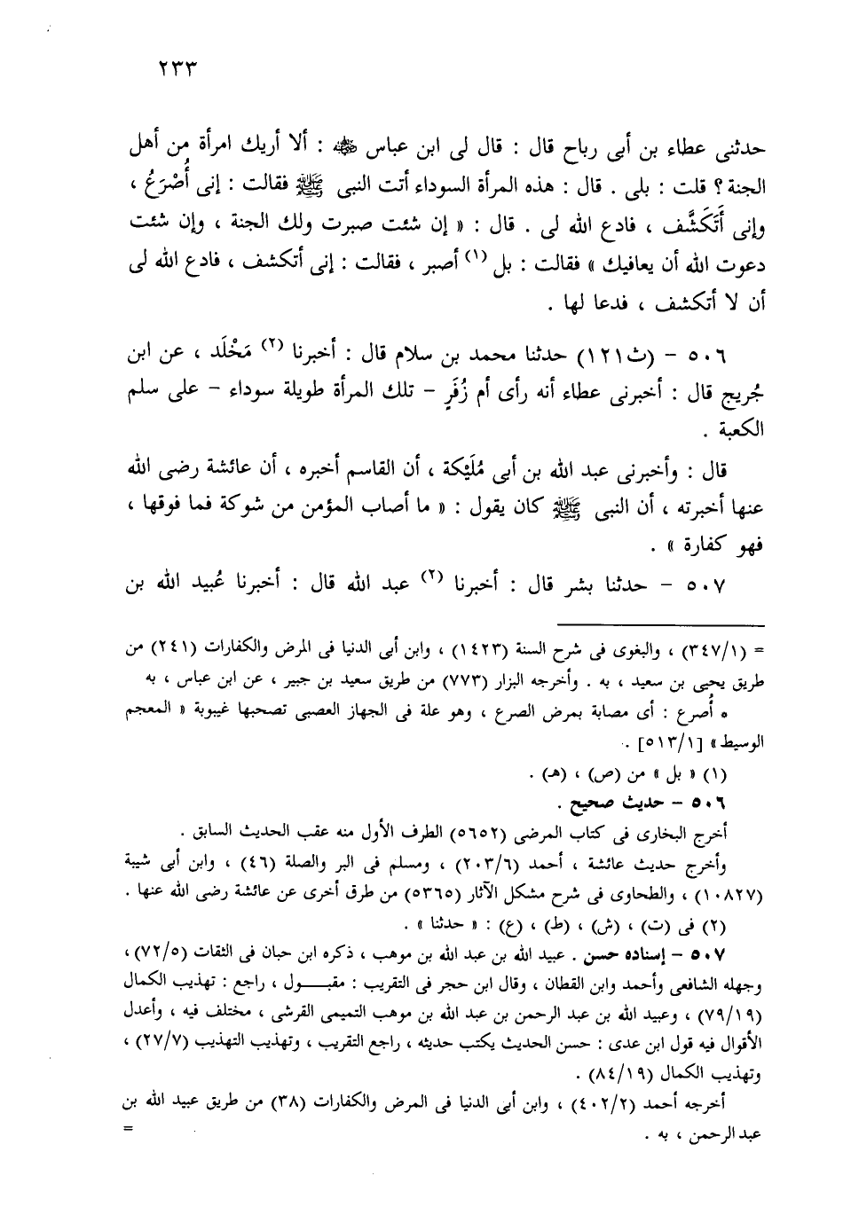 507- حَدثنا بِشْرٌ، قَالَ: حَدثنا عَبْدُ اللهِ، قَالَ: حَدثنا عُبَيْدُ اللهِ بْنُ عَبْدِ الرَّحْمَنِ بْنِ عَبْدِ اللهِ بْنِ مَوْهَبٍ قَالَ: حَدَّثَنِي عَمِّي عُبَيْدُ اللهِ بْنُ عَبْدِ اللهِ بْنِ مَوْهَبٍ قَالَ: سَمِعْتُ أَبَا هُرَيْرَةَ يَقُولُ: قَالَ رَسُولُ اللهِ صَلى الله عَلَيهِ وسَلم: مَا مِنْ مُسْلِمٍ يُشَاكُ شَوْكَةً فِي الدُّنْيَا يَحْتَسِبُهَا، إِلاَّ قُصَّ بِهَا مِنْ خَطَايَاهُ يَوْمَ الْقِيَامَةِ.