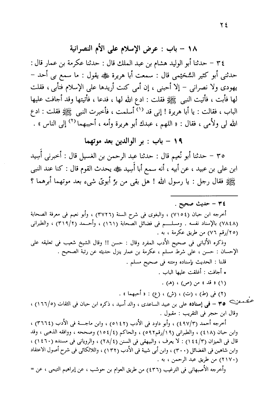 34- حَدثنا أَبُو الْوَلِيدِ هِشَامُ بْنُ عَبْدِ الْمَلِكِ، قَالَ: حَدثنا عِكْرِمَةُ بْنُ عَمَّارٍ قَالَ: حَدَّثَنِي أَبُو كَثِيرٍ السُّحَيْمِيُّ قَالَ: سَمِعْتُ أَبَا هُرَيْرَةَ يَقُولُ: مَا سَمِعَ بِي أَحَدٌ، يَهُودِيٌّ وَلاَ نَصْرَانِيٌّ، إِلاَّ أَحَبَّنِي، إِنَّ أُمِّي كُنْتُ أُرِيدُهَا عَلَى الإِسْلاَمِ فَتَأْبَى، فَقُلْتُ لَهَا، فَأَبَتْ، فَأَتَيْتُ النَّبِيَّ صَلى الله عَلَيهِ وسَلم فَقُلْتُ: ادْعُ اللهَ لَهَا، فَدَعَا، فَأَتَيْتُهَا، وَقَدْ أَجَافَتْ عَلَيْهَا الْبَابَ، فَقَالَتْ: يَا أَبَا هُرَيْرَةَ، إِنِّي قَدْ أَسْلَمْتُ، فَأَخْبَرْتُ النَّبِيَّ صَلى الله عَلَيهِ وسَلم فَقُلْتُ: ادْعُ اللهَ لِي وَلِأُمِّي، فَقَالَ: اللَّهُمَّ، عَبْدُكَ أَبُو هُرَيْرَةَ وَأُمُّهُ، أَحِبَّهُمَا إِلَى النَّاسِ.