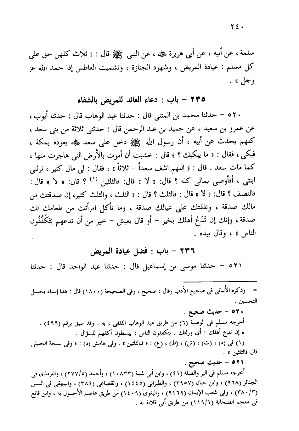 520- حَدثنا مُحَمَّدُ بْنُ الْمُثَنَّى، قَالَ: حَدثنا عَبْدُ الْوَهَّابِ، قَالَ: حَدثنا أَيُّوبُ، عَنْ عَمْرِو بْنِ سَعِيدٍ، عَنْ حُمَيْدِ بْنِ عَبْدِ الرَّحْمَنِ قَالَ: حَدَّثَنِي ثَلاَثَةٌ مِنْ بَنِي سَعْدٍ كُلُّهُمْ يُحَدِّثُ عَنْ أَبِيهِ أَنَّ رَسُولَ اللهِ صَلى الله عَلَيهِ وسَلم دَخَلَ عَلَى سَعْدٍ يَعُودُهُ بِمَكَّةَ، فَبَكَى، فَقَالَ: مَا يُبْكِيكَ؟، قَالَ: خَشِيتُ أَنْ أَمُوتَ بِالأَرْضِ الَّتِي هَاجَرْتُ مِنْهَا كَمَا مَاتَ سَعْدٌ، قَالَ: اللَّهُمَّ اشْفِ سَعْدًا ثَلاَثًا، فَقَالَ: لِي مَالٌ كَثِيرٌ، يَرِثُنِي ابْنَتَيْ، أَفَأُوصِي بِمَالِي كُلِّهِ؟ قَالَ: لاَ، قَالَ: فَبِالثُّلُثَيْنِ؟ قَالَ: لاَ، قَالَ: فَالنِّصْفُ؟ قَالَ: لاَ، قَالَ: فَالثُّلُثُ؟ قَالَ: الثُّلُثُ، وَالثُّلُثُ كَثِيرٌ، إِنَّ صَدَقَتَكَ مِنْ مَالِكَ صَدَقَةٌ، وَنَفَقَتَكَ عَلَى عِيَالِكَ صَدَقَةٌ، وَمَا تَأْكُلُ امْرَأَتُكَ مِنْ طَعَامِكَ لَكَ صَدَقَةٌ، وَإِنَّكَ أَنْ تَدَعَ أَهْلَكَ بِخَيْرٍ، أَوْ قَالَ: بِعَيْشٍ، خَيْرٌ مِنْ أَنْ تَدَعَهُمْ يَتَكَفَّفُونَ النَّاسَ، وَقَالَ بِيَدِهِ.