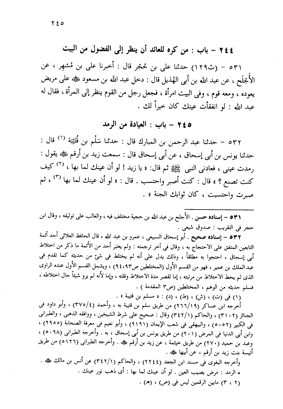 531- حَدثنا عَلِيُّ بْنُ حُجْرٍ، قَالَ: أَخْبَرَنَا عَلِيُّ بْنُ مُسْهِرٍ، عَنِ الأَجْلَحِ، عَنْ عَبْدِ اللهِ بْنِ أَبِي الْهُذَيْلِ قَالَ: دَخَلَ عَبْدُ اللهِ بْنُ مَسْعُودٍ عَلَى مَرِيضٍ يَعُودُهُ، وَمَعَهُ قَوْمٌ، وَفِي الْبَيْتِ امْرَأَةٌ، فَجَعَلَ رَجُلٌ مِنَ الْقَوْمِ يَنْظُرُ إِلَى الْمَرْأَةِ، فَقَالَ لَهُ عَبْدُ اللهِ: لَوْ انْفَقَأَتْ عَيْنُكَ كَانَ خَيْرًا لَكَ.