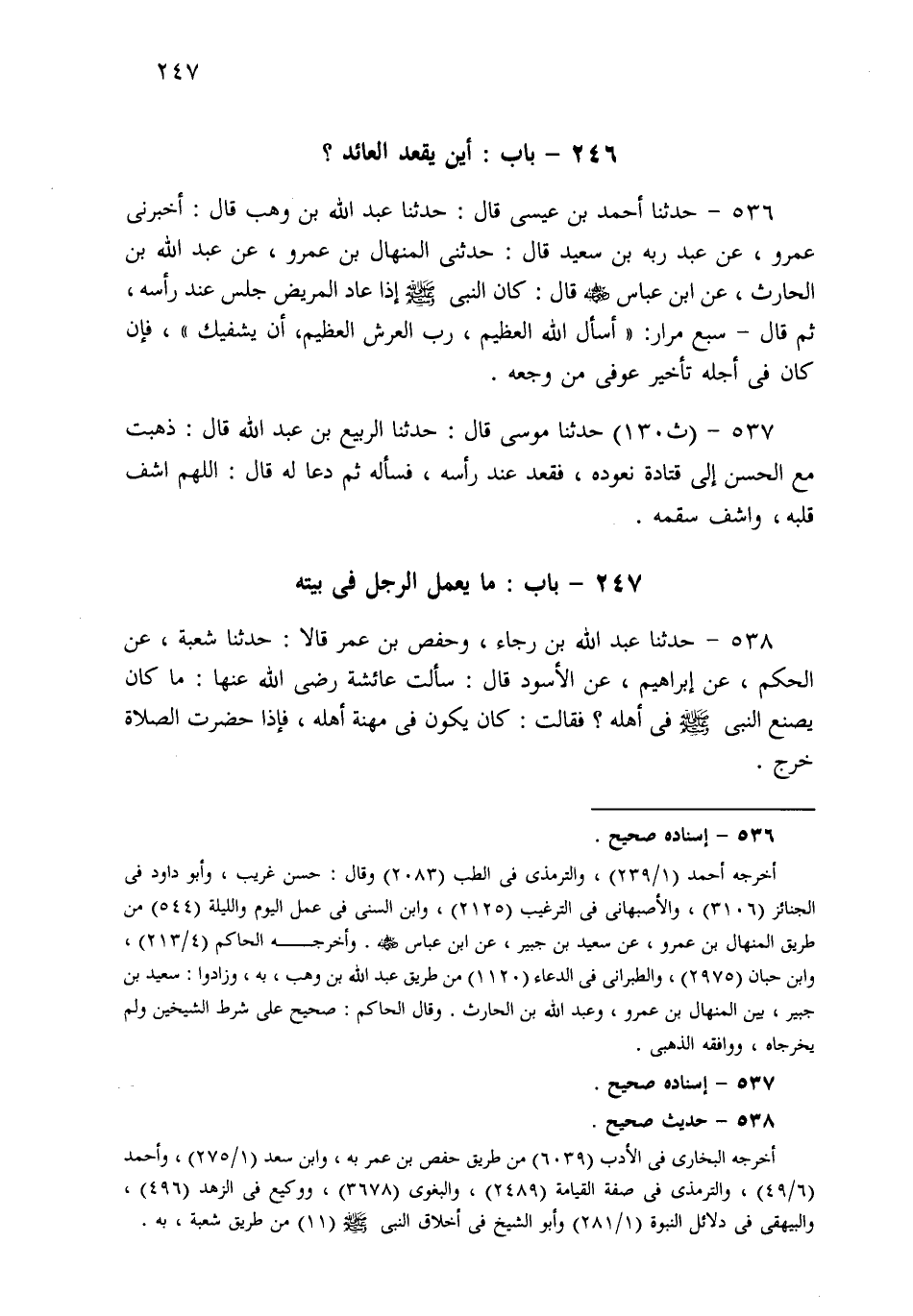 536- حَدثنا أَحْمَدُ بْنُ عِيسَى، قَالَ: حَدثنا عَبْدُ اللهِ بْنُ وَهْبٍ قَالَ: أَخْبَرَنِي عَمْرٌو، عَنْ عَبْدِ رَبِّهِ بْنِ سَعِيدٍ قَالَ: حَدَّثَنِي الْمِنْهَالُ بْنُ عَمْرٍو، عَنْ عَبْدِ اللهِ بْنِ الْحَارِثِ، عَنِ ابْنِ عَبَّاسٍ قَالَ: كَانَ النَّبِيُّ صَلى الله عَلَيهِ وسَلم إِذَا عَادَ الْمَرِيضَ جَلَسَ عِنْدَ رَأْسِهِ، ثُمَّ قَالَ سَبْعَ مِرَارٍ: أَسْأَلُ اللهَ الْعَظِيمَ، رَبَّ الْعَرْشِ الْعَظِيمِ، أَنْ يَشْفِيكَ، فَإِنْ كَانَ فِي أَجَلِهِ تَأْخِيرٌ عُوفِيَ مِنْ وَجَعِهِ.
